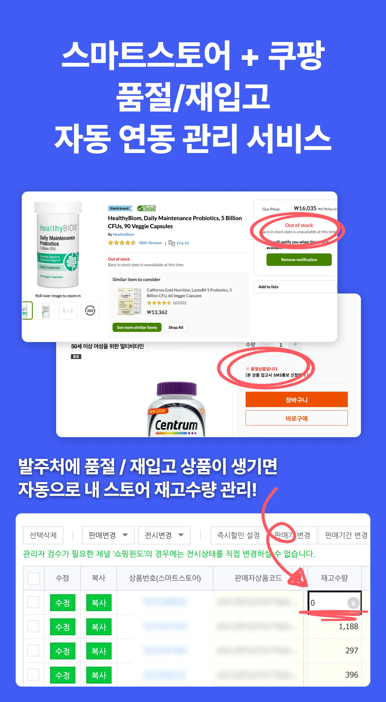 주문이 들어왔는데 품절이어서 고민이신가요? 아이허브/오플은 하루에도 평균적으로 40~60건의 상품이 품절되거나 재입고됩니다. 품절/재입고 연동 서비스를 이용하시면 아이허브/오플에서 품절이 나면 고객님 스토어의 상품을 품절처리 하고, 재입고가 들어오면 바로 재입고처리를 해 드립니다 (저희 솔루션 이용 등록상품 한정)