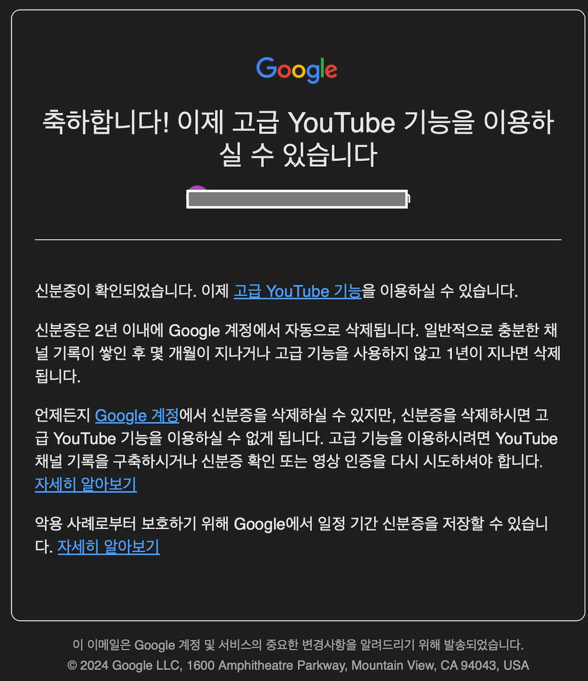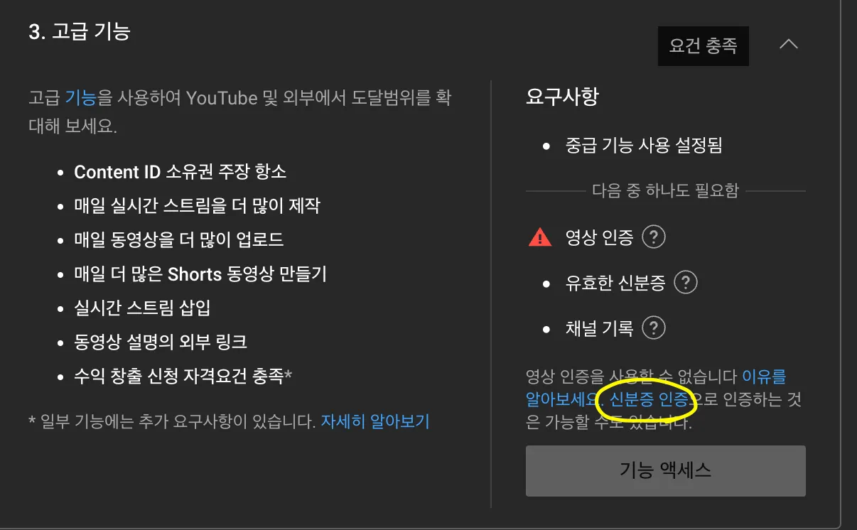 고급기능은 유튜브 영상에 “더보기에 링크”를 넣고, “썸네일 적용”, “댓글 고정”을 위해 유튜브가 인증을 요구하는 기능입니다.