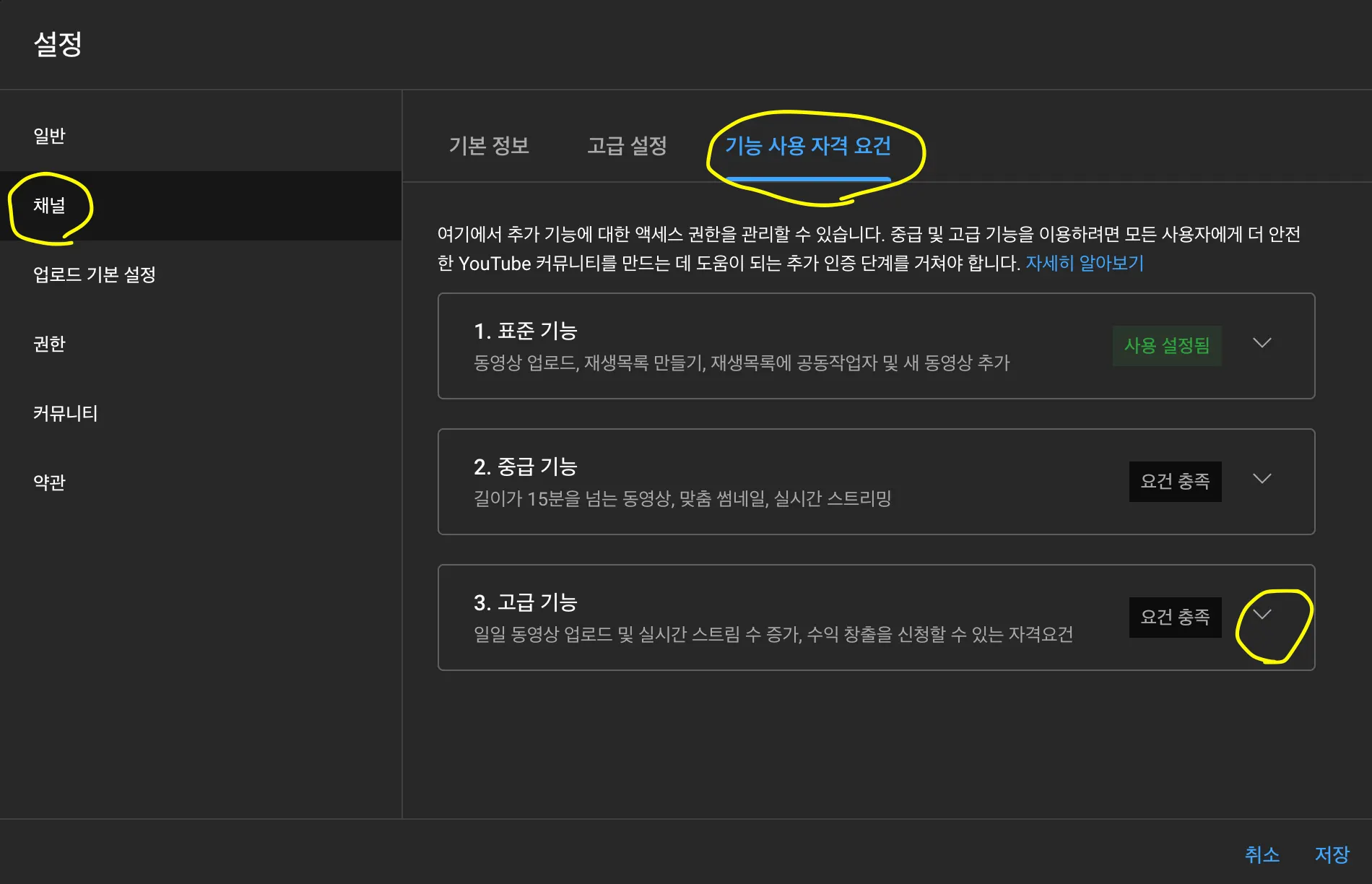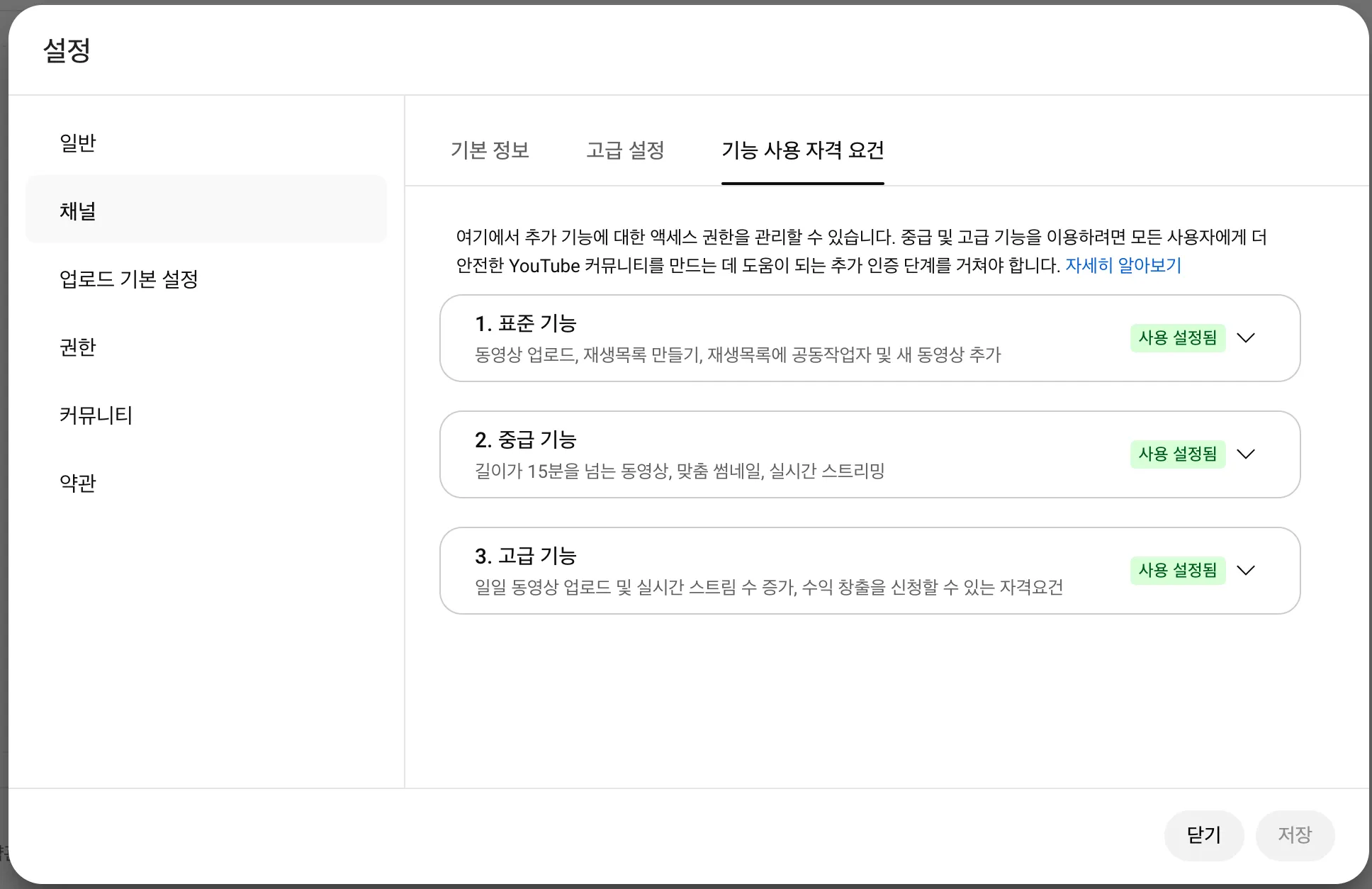 설정 화면의 채널 - 기능 사용 자격 요건 - 고급 기능을 클릭합니다. (2. 중급 기능 완료 후 가능)