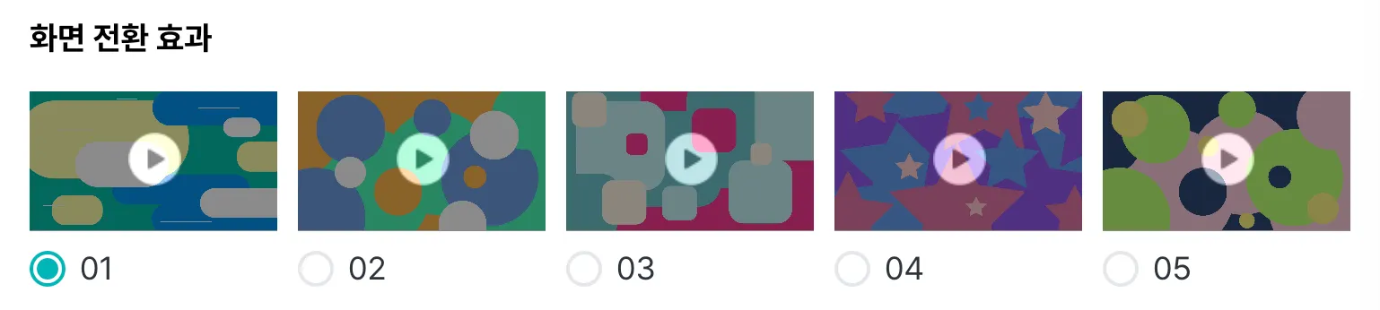 소개하는 상품이 여럿 있을 때, 상품과 상품 사이에 전환될 때 삽입되는 화면이에요. 다섯 개를 준비해 두었으니 마음에 드는 전환효과를 선택해 보세요.