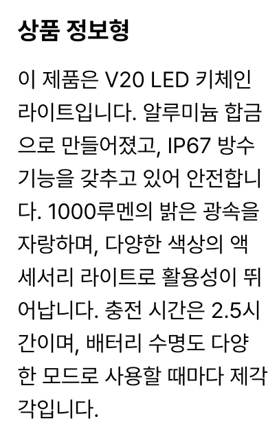 상품 정보형 대본은, 아래와 같이 상품과 관련된 정보(스펙, 기능, 효과, 디자인 등)에 집중하여 영상 대본을 만듭니다. 상품의 정보를 소개하고자 하는 경우에 적합합니다.