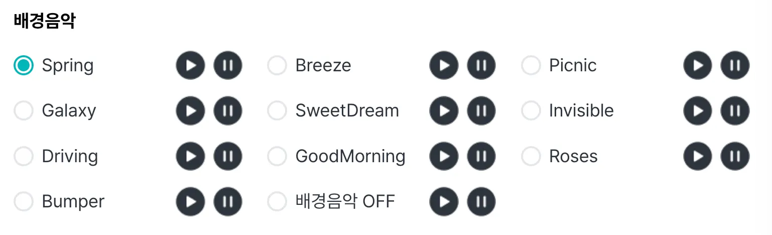 영상에 깔리는 배경음악을 선택할 수 있습니다. 제일 마음에 드는 음악을 선택해 보세요.