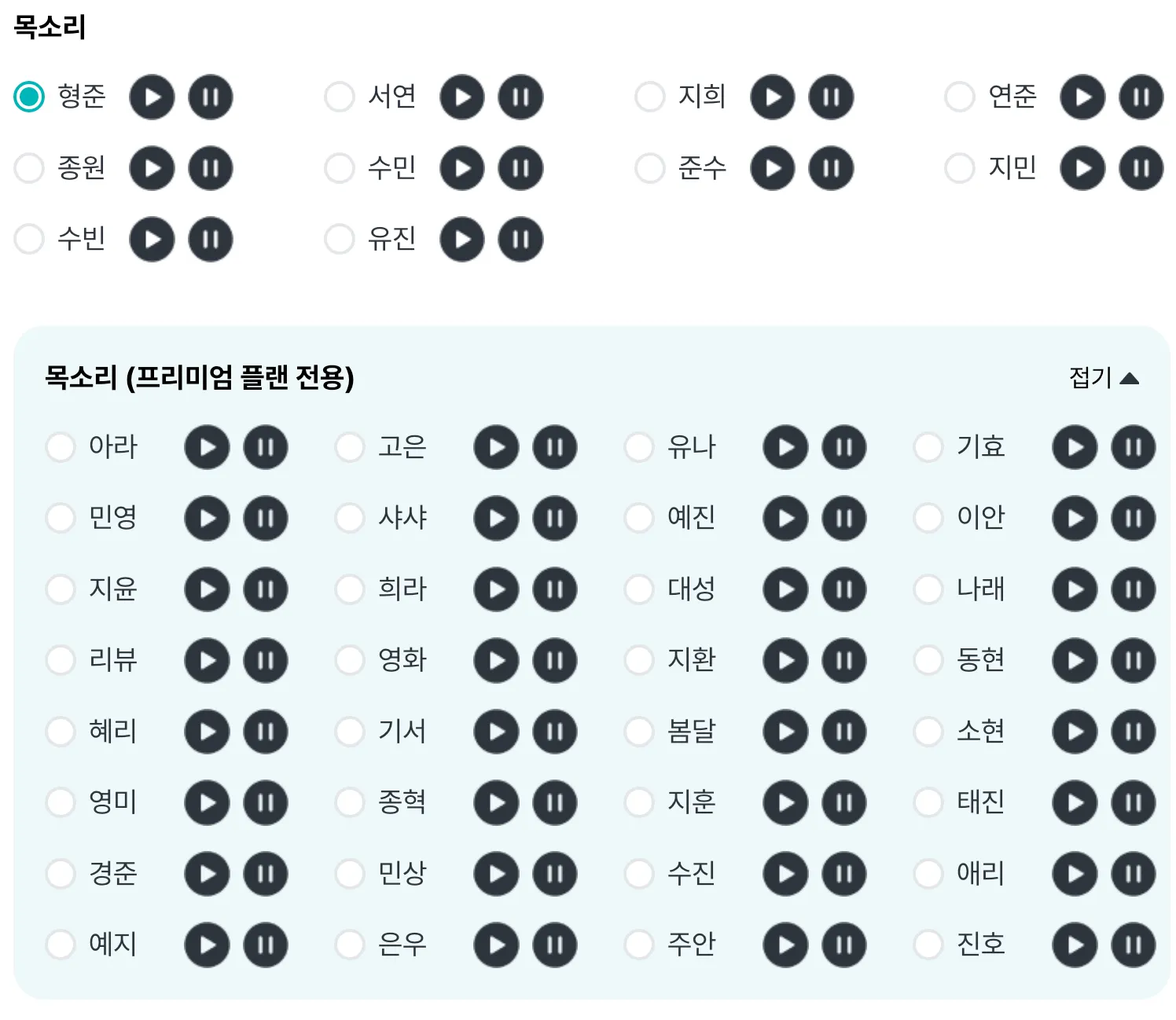 다양한 목소리를 준비해 두었습니다. 직접 들어보시고, 성별과 목소리의 느낌을 보면서 상품별로 목소리를 바꿔 보세요.