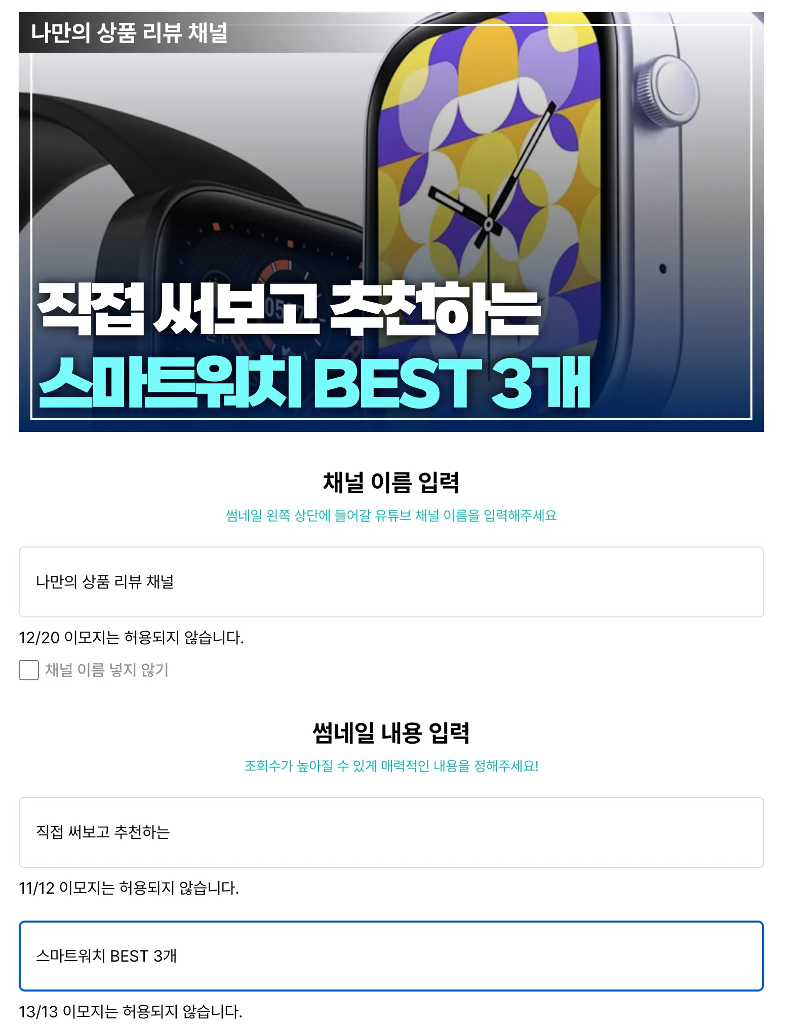 이 때, 채널 이름 입력 란과 썸네일 내용 입력 란이 있습니다.