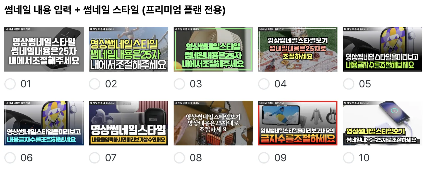 01번 부터 10번 썸네일 까지 원하는 썸네일 디자인을 클릭하여 내용을 썸네일을 다르게 사용할 수 있습니다.