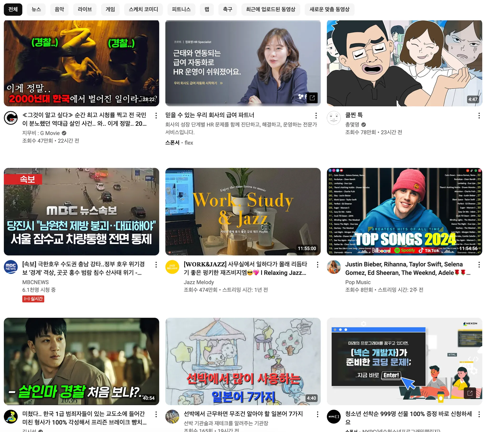 유튜브는 접속하면 아래와 알고리즘에 따라 시청자마다 아래와 같은 방식으로 영상을 보여주고 있습니다. 시청자들은 영상을 일일이 다 볼 수 없기 때문에, 썸네일만 보고 영상을 볼지 말지를 선택하게 됩니다.