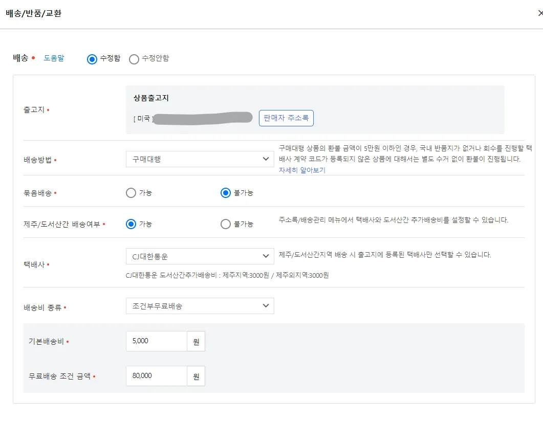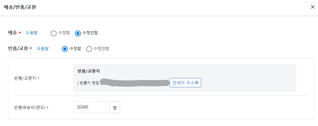 아래와 같이 쉽게 배송정책을 수정하실 수 있고, 반품비도 쉽게 수정하실 수 있습니다.
