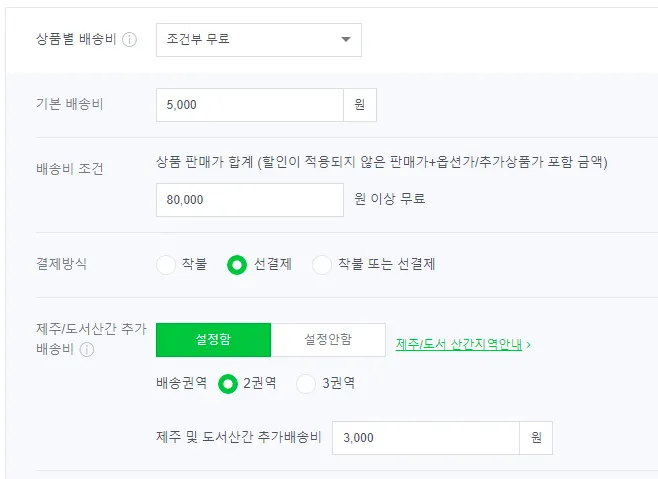 그 후 아래와 같이, 상품별 배송비에서 유료배송/무료배송/조건부무료배송 등을 설정하실 수 있고, 제주/도서산간 배송비도 설정하실 수 있습니다. 아래는 예시 세팅입니다.
