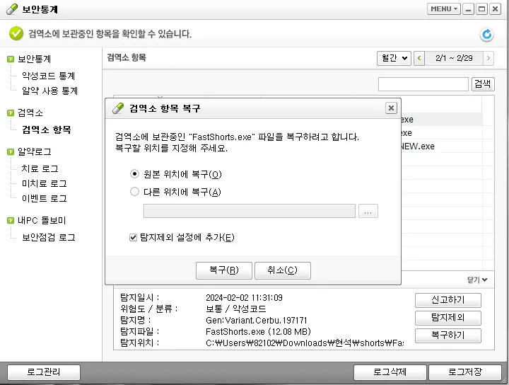 ‘원본 위치에 복구’, ‘탐지제외 설정에 추가’ 선택 후 ‘복구’를 진행합니다.