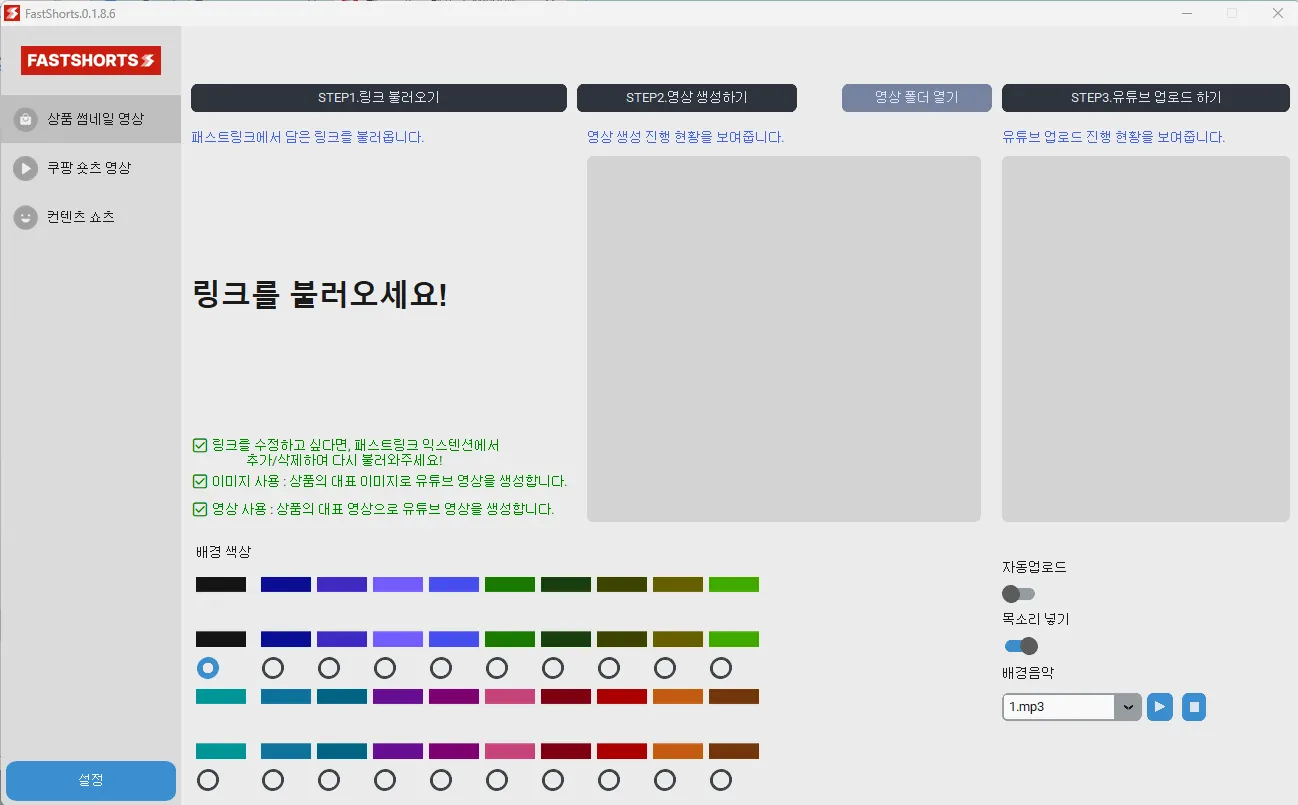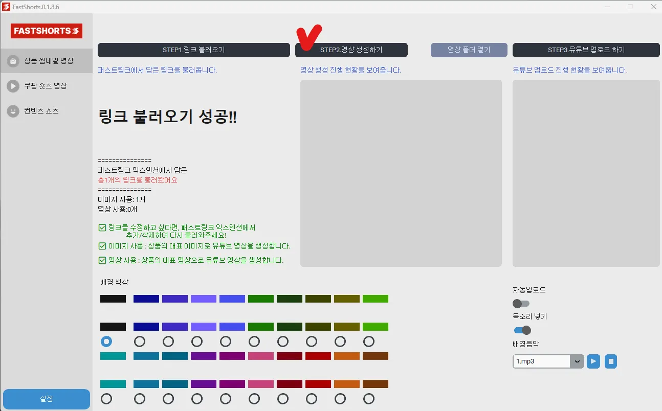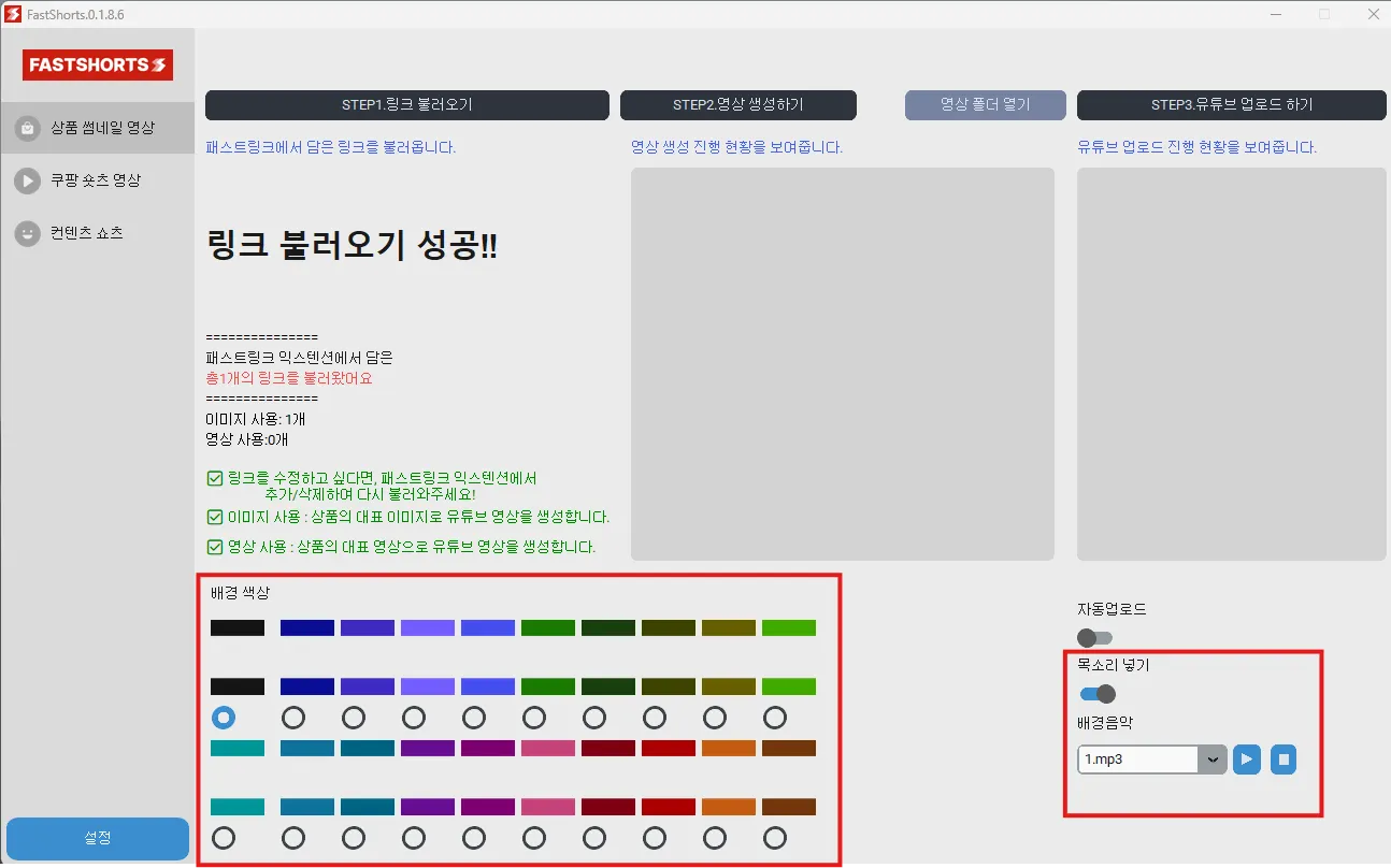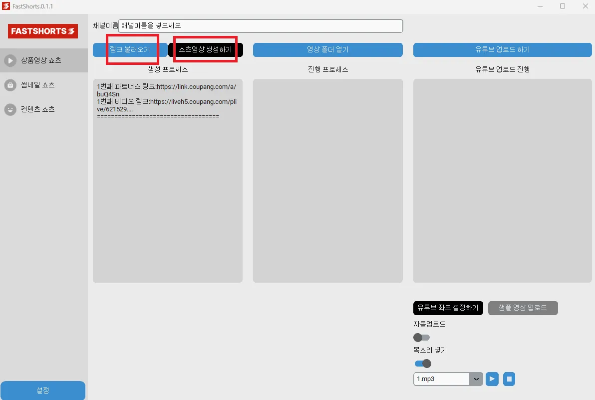 링크 불러오기를 클릭, 하면 생성프로세스에 대상 링크들이 뜨고, 쇼츠영상 생성하기를 누르면 생성이 시작됩니다.
