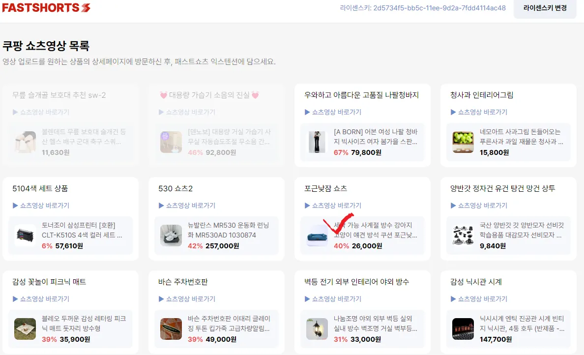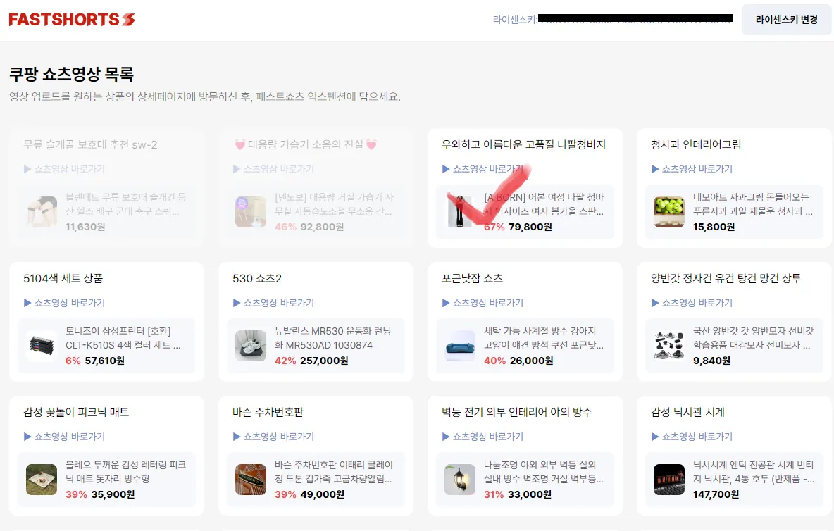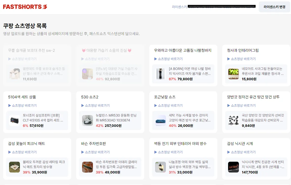 제품 영상의 쿠팡 파트너스 확보를 위해서 아래 폐쇄 사이트에 접속하여 라이센스키를 입력합니다.
