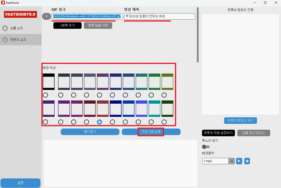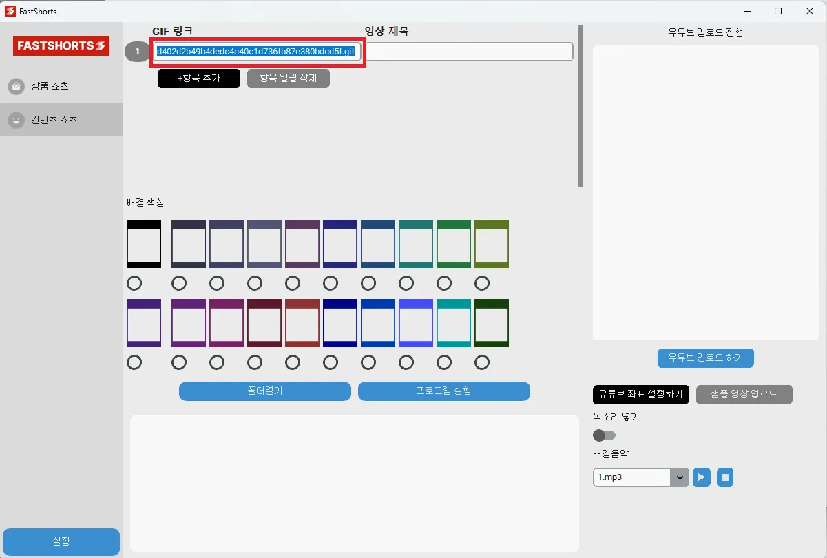 영상제목에 .gif를 제외하고 붙여넣고, 배경색상을 고른 후 ‘프로그램 실행’을 클릭합니다.