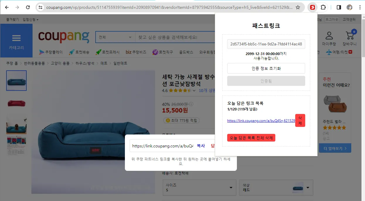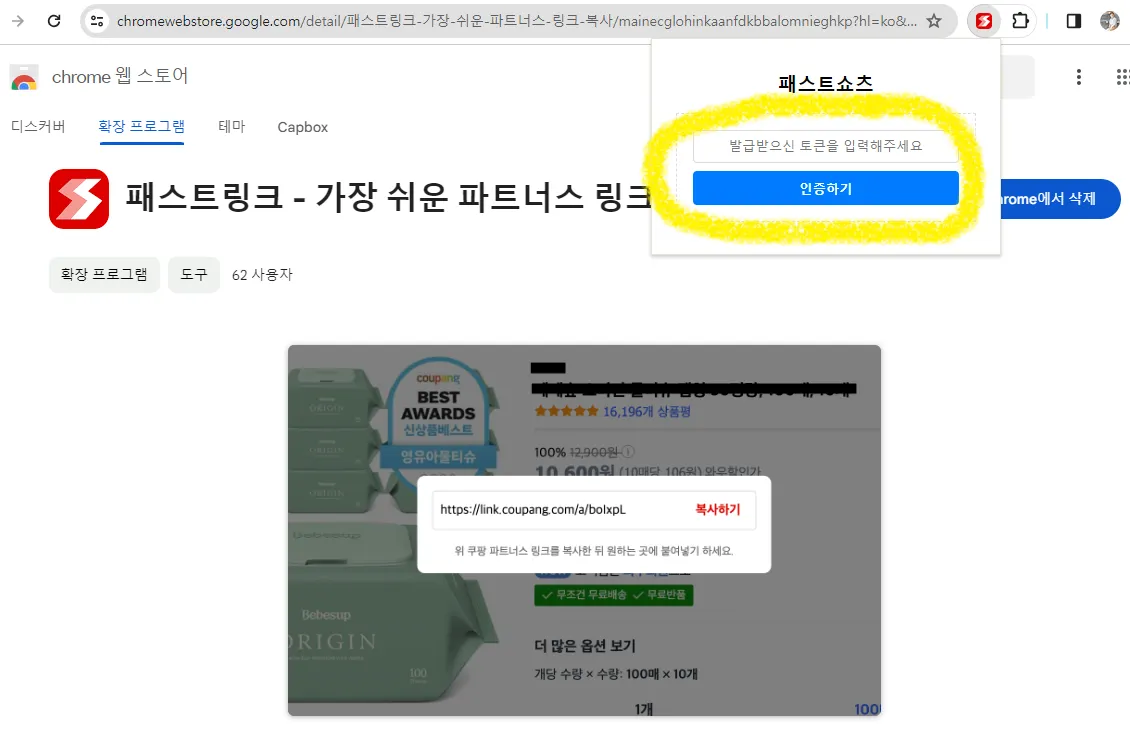 쿠팡 상세페이지로 이동하여, 패스트링크 익스텐션 기능 하단 이미지를 클릭하여 쿠팡 파트너스 링크를 확보할 수 있습니다.