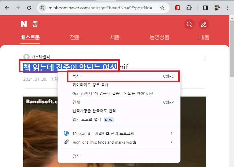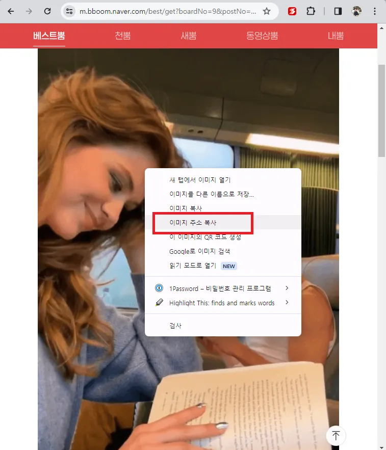 움직이는 이미지(GIF) 파일에서 마우스 우클릭 후, “이미지 주소 복사”를 클릭합니다.