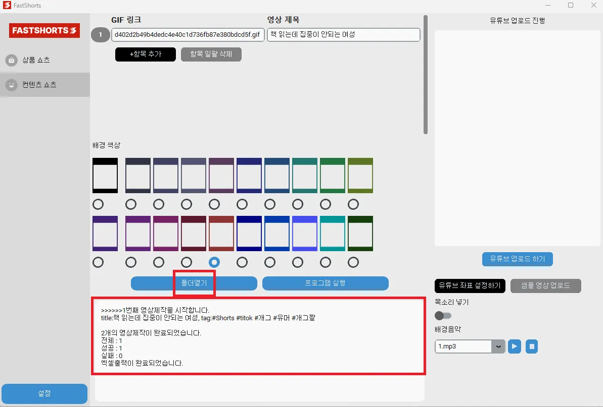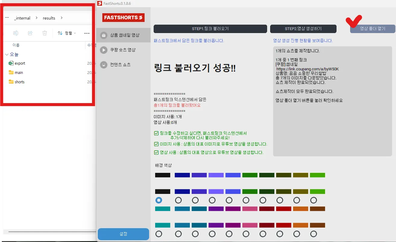 다수의 링크를 넣어서 쇼츠를 생성합니다. → 완료 후 폴더를 확인하여 영상과 엑셀 파일을 확인합니다.