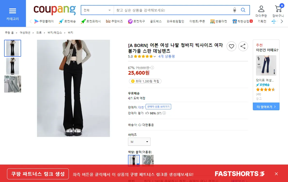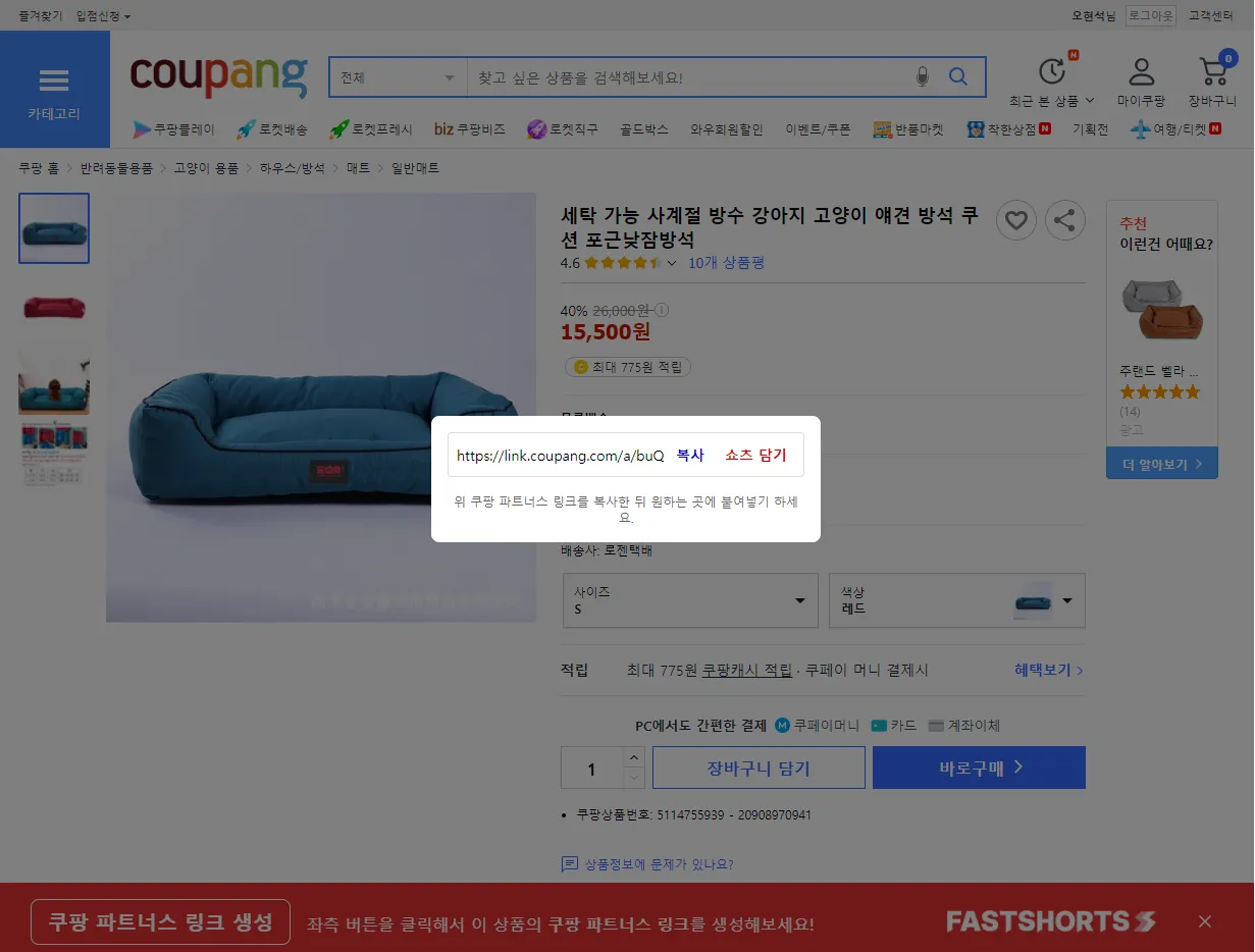 쿠팡 상품 상세페이지에서 패스트링크를 활용하여 “쇼츠 담기”를 선택합니다.