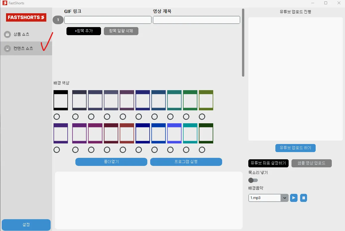 크롬창을 전체 화면으로 설정후, 패스트쇼츠를 실행하여 “(샘플)자동업로드” 버튼을 실행합니다.