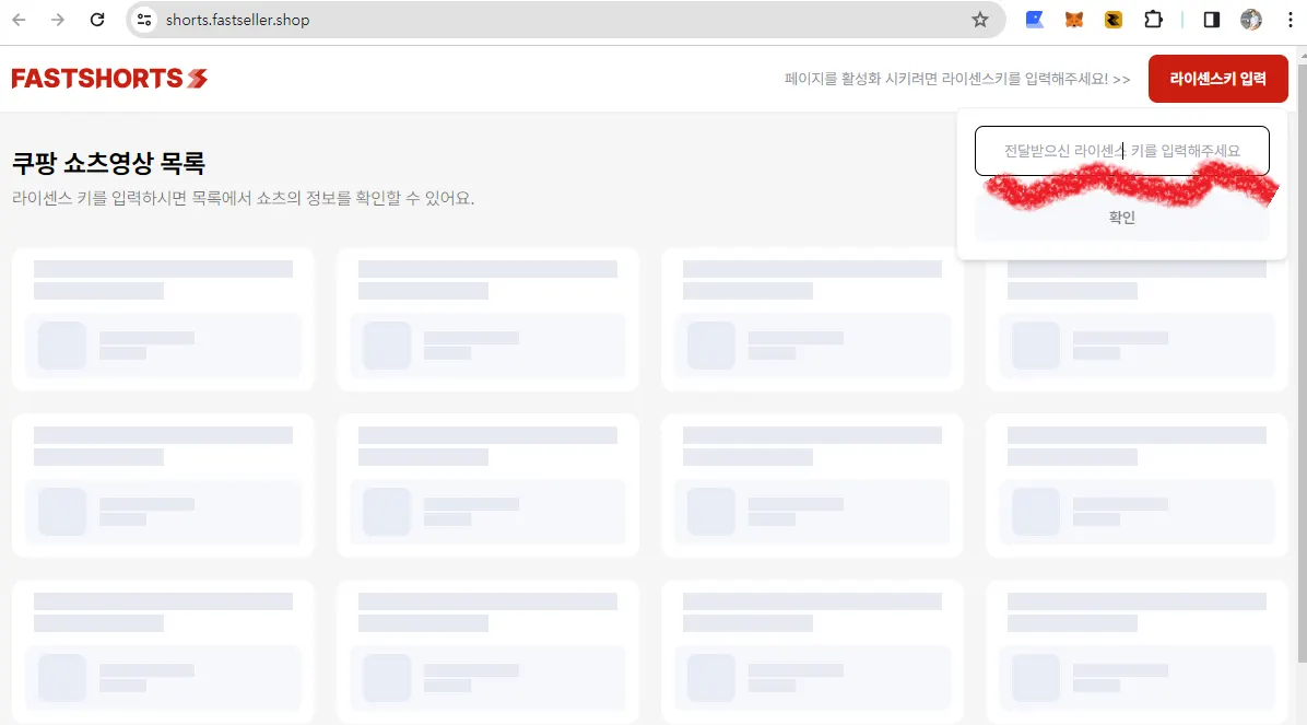 패스트쇼츠에서 받은 라이센스키를 입력합니다.