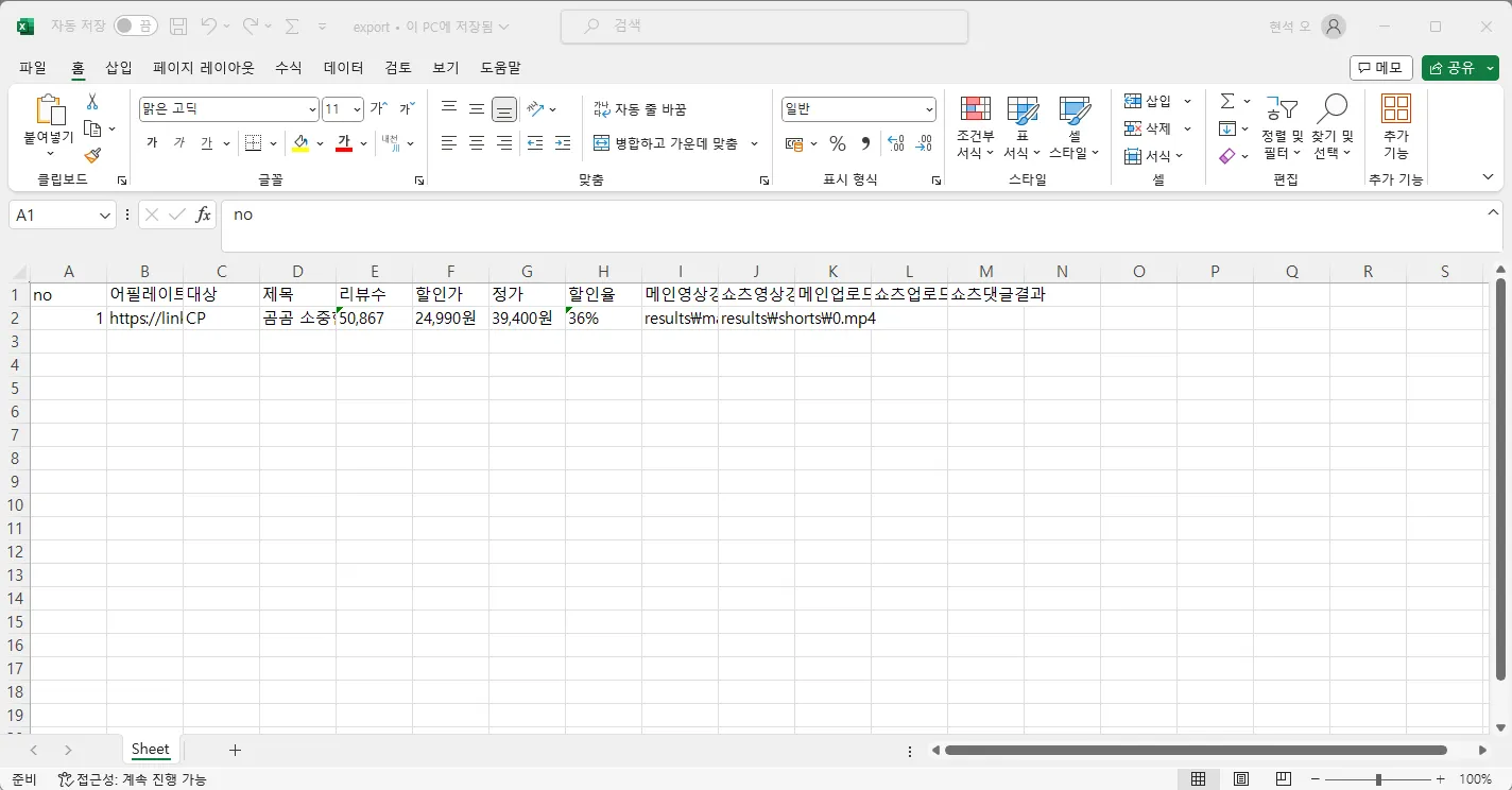 export 엑셀 파일에 각 영상의 상세 정보가 들어 있습니다. 메인영상경로, 쇼츠영상경로에 ‘성공’이 있으면, 영상 제작이 성공 되었습니다.