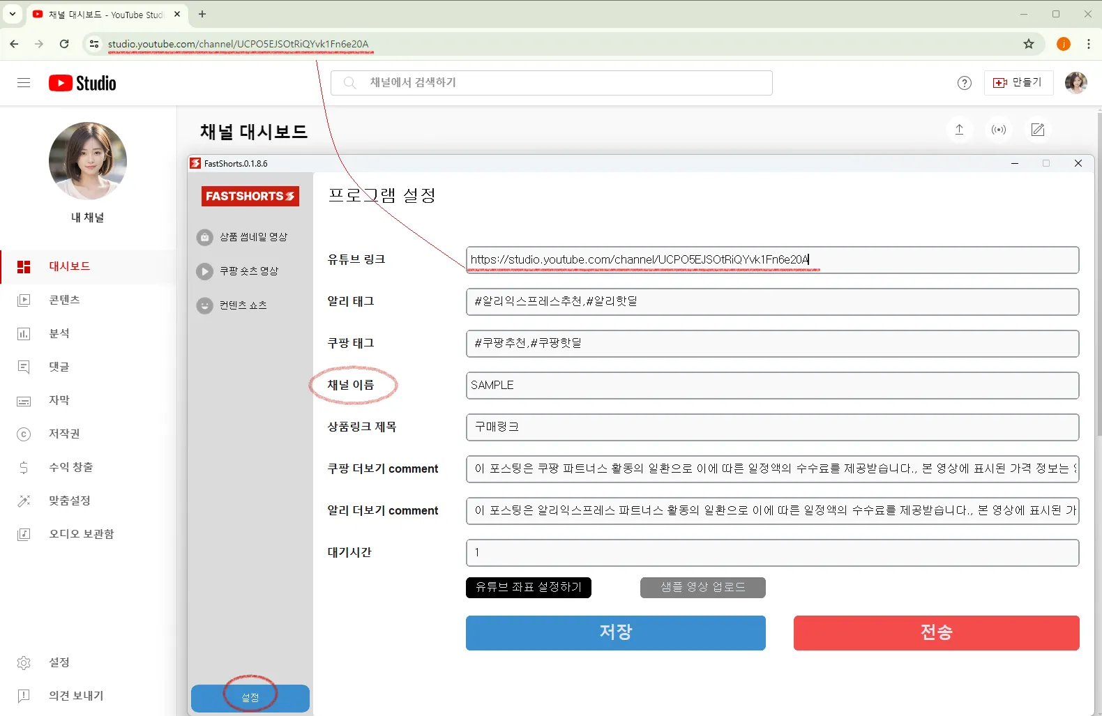 크롬 브라우저로 유튜브 스튜디오에 접속, 주소를 복사해서, 패스트쇼츠 ‘유튜브 링크’에 붙여넣기 합니다.