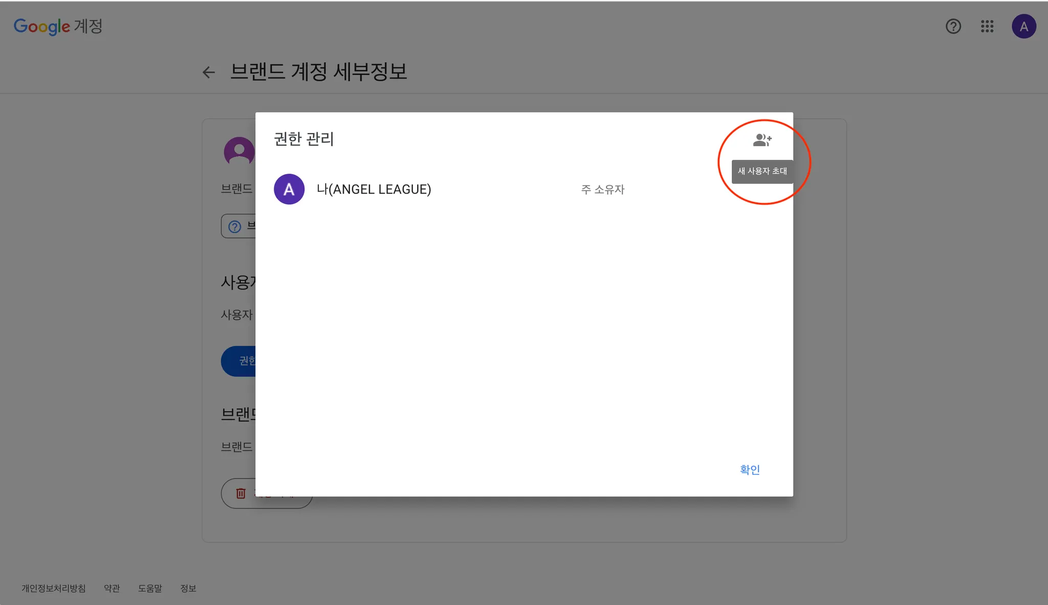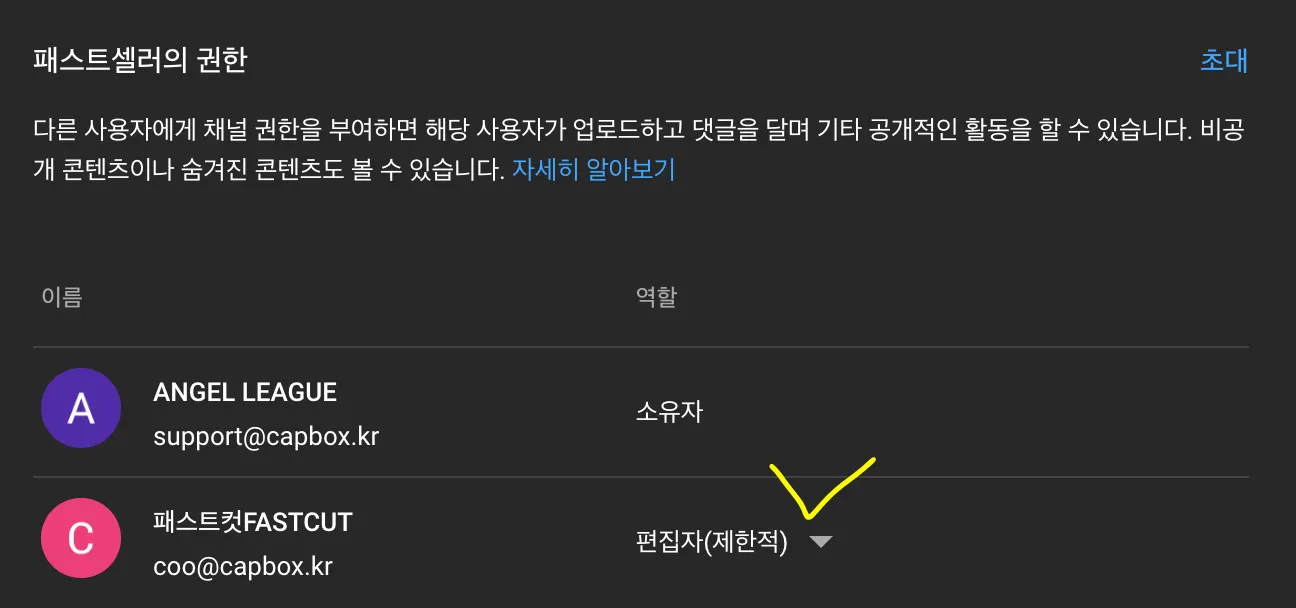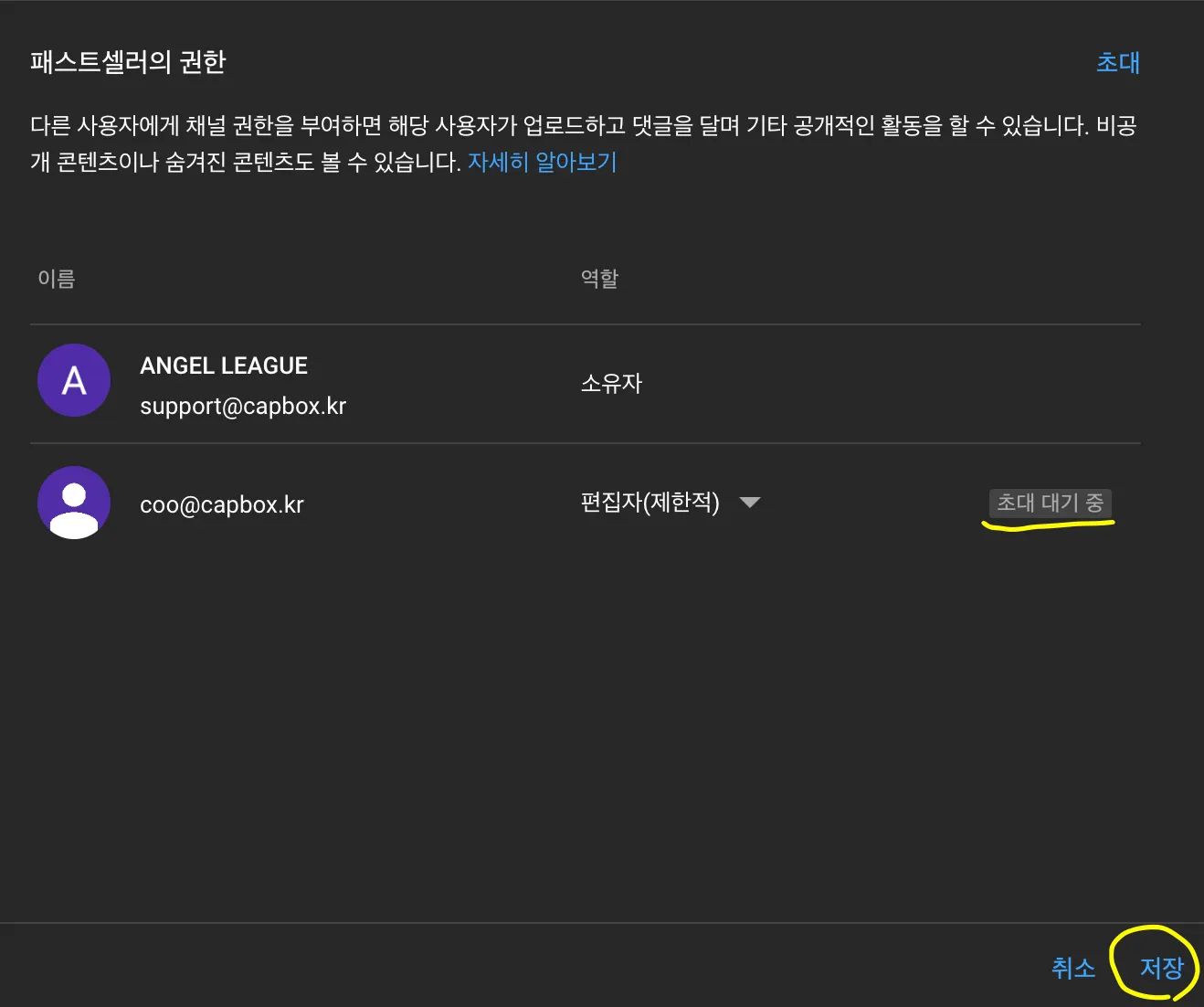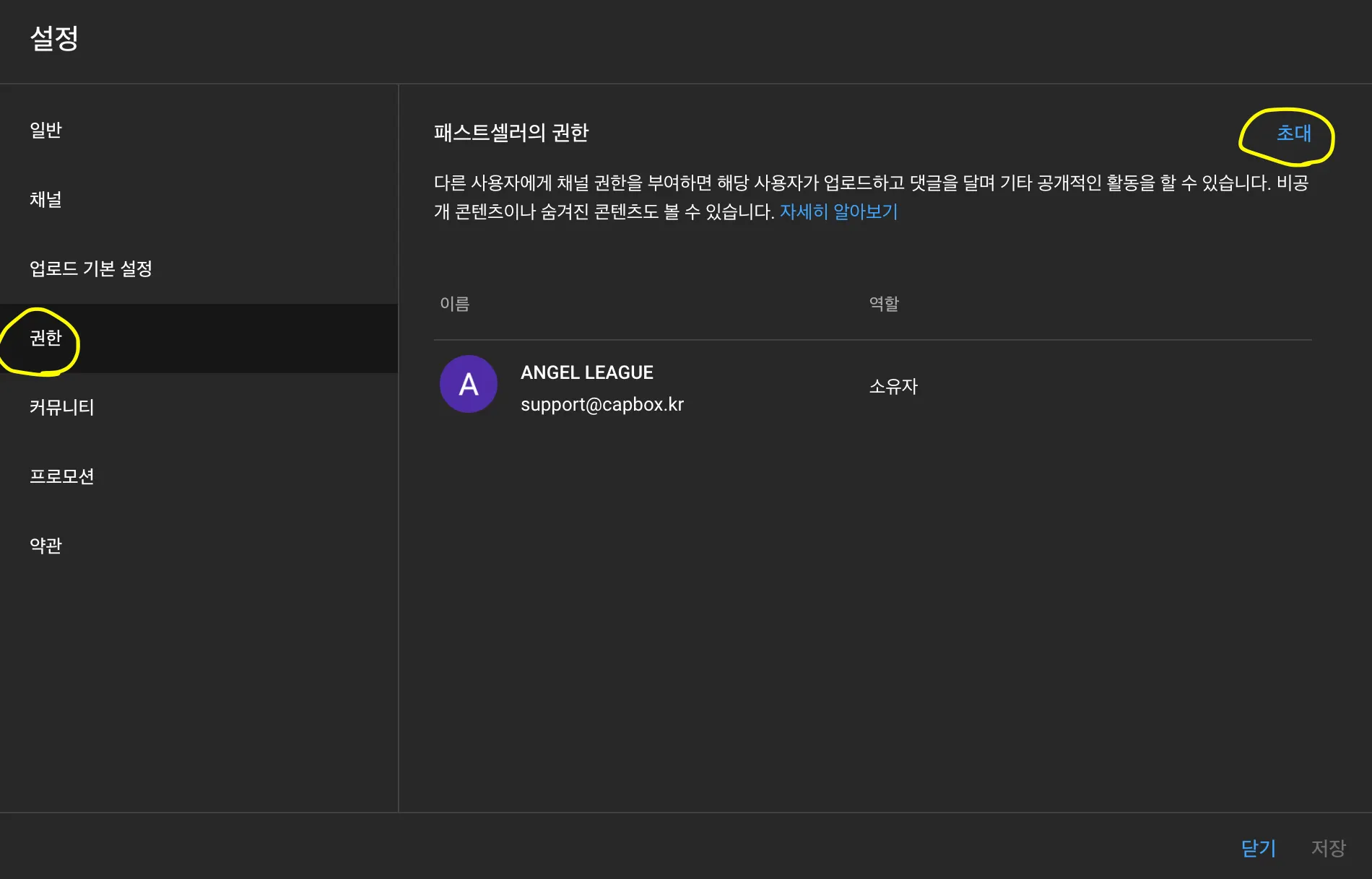 '권한' 메뉴에서 ‘초대’ 버튼을 누릅니다.