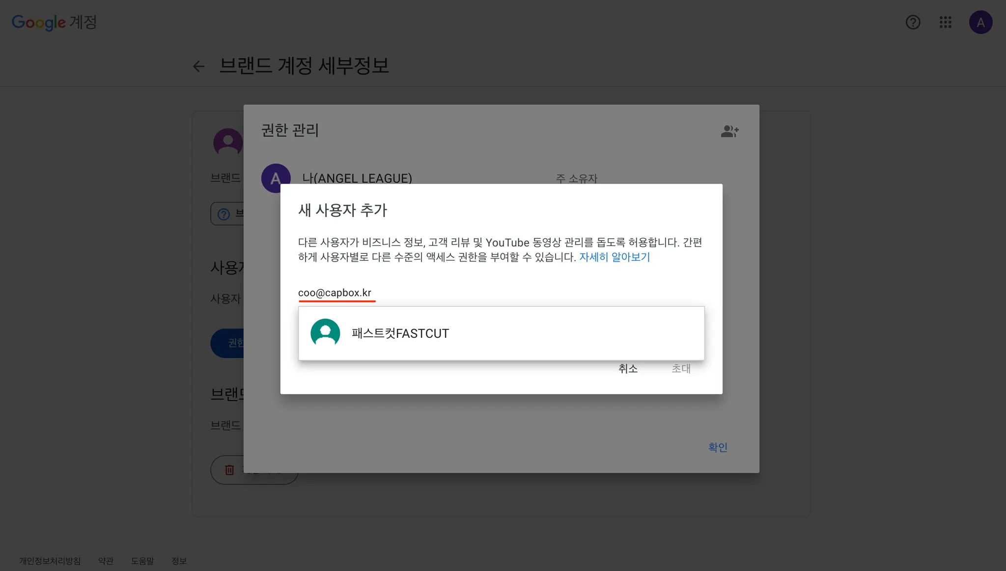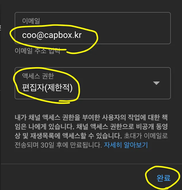 눌러 권한을 부여하고자 하는 이메일에 coo@capbox.kr을 입력하고, 엑세스 권한은 ‘편집자(제한적)’을 선택하고 ‘완료’를 누릅니다.