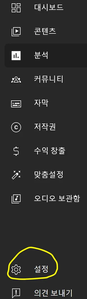 유튜브 스튜디오 화면의 좌측 하단 ‘설정’ 버튼을 클릭합니다.
