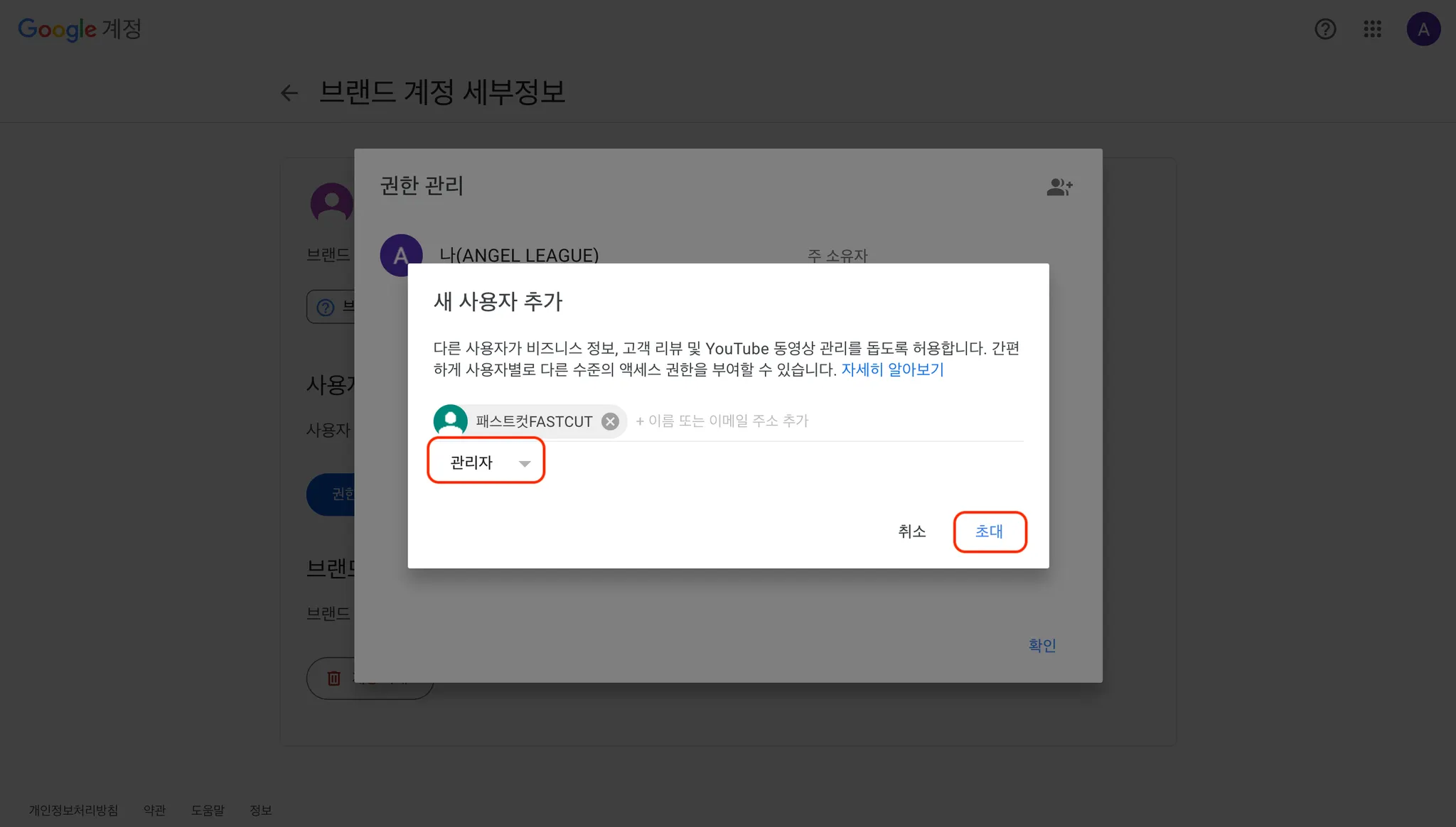 ‘관리자’ 선택 후, ‘초대’를 선택 합니다.