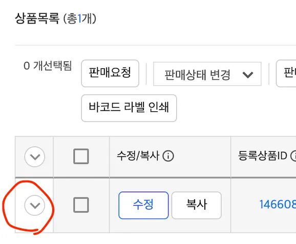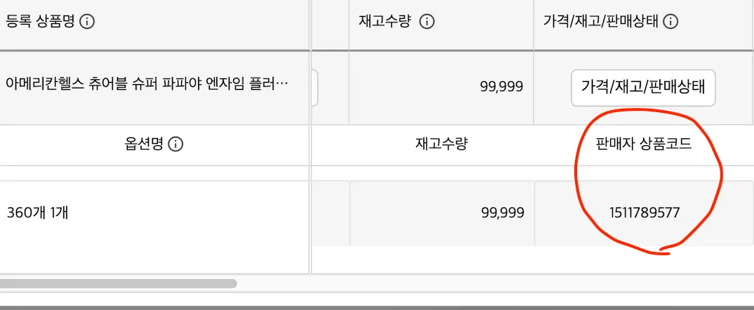 아래쪽 슬라이드 바를 움직여 해당 상품의판매자 상품코드를 확인합니다.