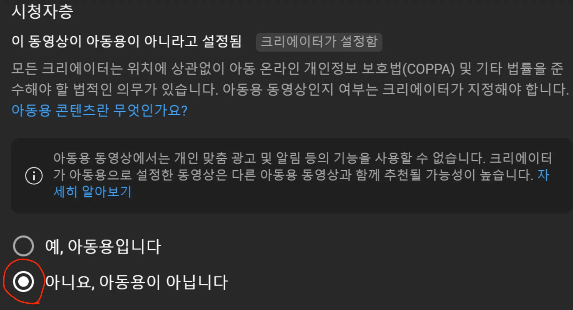 5) 화면을 스크롤하여 아래로 내려가면, 시청자층 란에 아동용 여부를 선택하는 란이 있습니다. 여기서 ‘아니요, 아동용이 아닙니다’를 선택합니다.