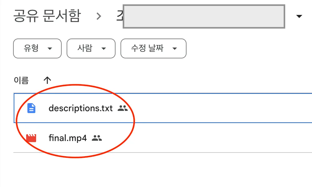 ‘생성 완료’버튼을 클릭하면 아래와 같이 구글 드라이브 사이트로 이동되고, 아래와 같이 파일이 2개 있습니다.