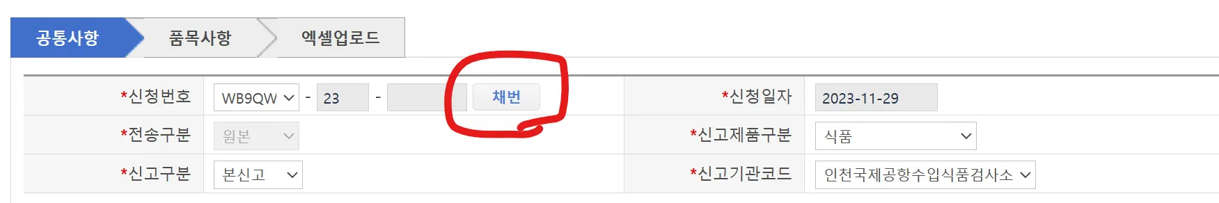 채번 버튼을 누르면 신청번호가 자동으로 따집니다.