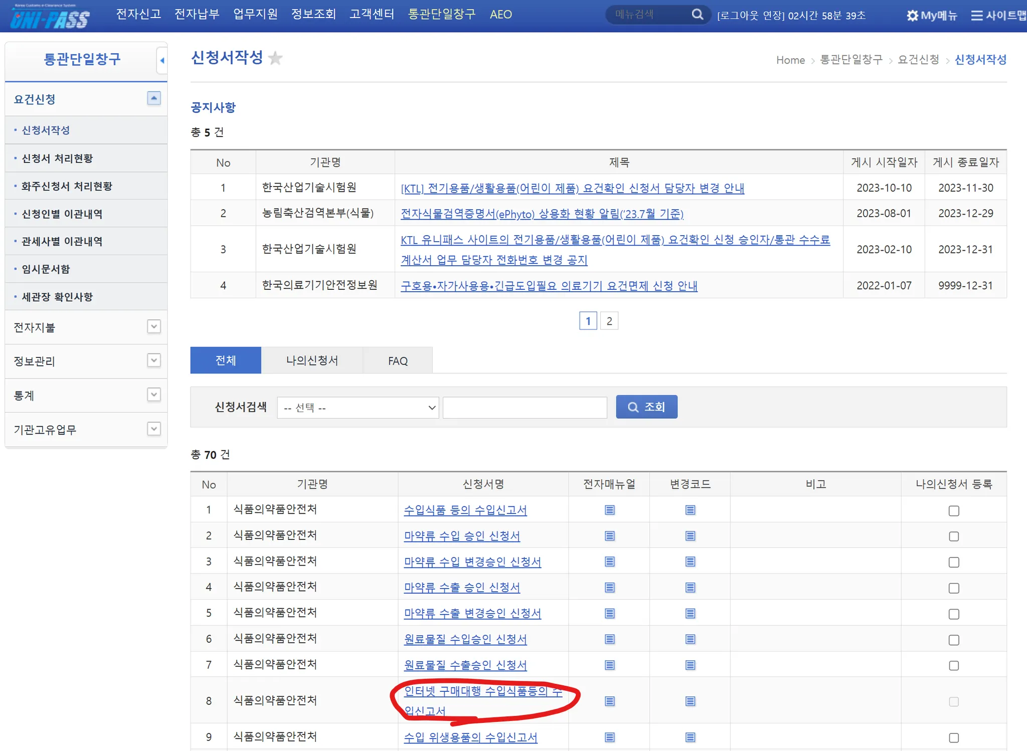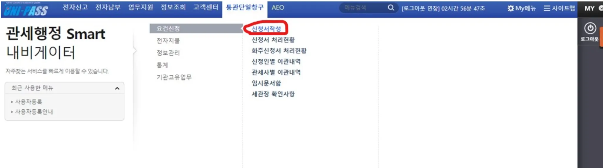 2. 통관단일창구 - 요건신청 - 신청서작성 클릭
