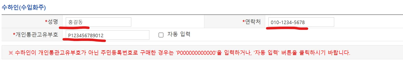 신고일반 란은 건너뛰고, 수하인(수입화주)란에 건기식을 받을 사람(고객 또는 고객이 지정한 수령인)의 성명, 휴대폰번호, 개인통관고유부호를 입력합니다.