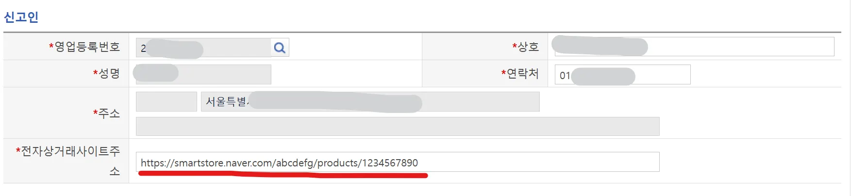 아래와 같이 기본정보가 입력됩니다. 전자상거래사이트주소 란에는 주문받은 상품의 스토어 주소를 입력하면 됩니다. (예: https://smartstore.naver.com/abcdefg/products/1234567890)