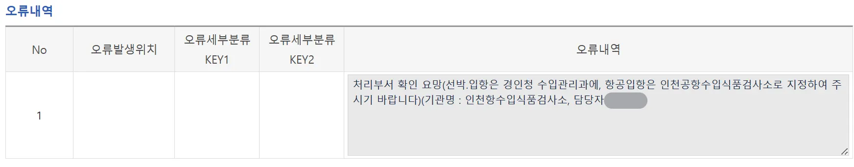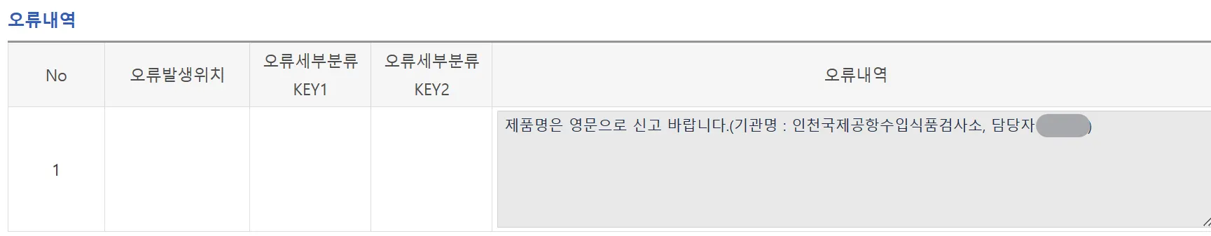 신청서에 오류(한글 상품명 입력, 식품을 식기로 신고, 다른 관할세관에 신고 )가 있는 경우 오류통보,