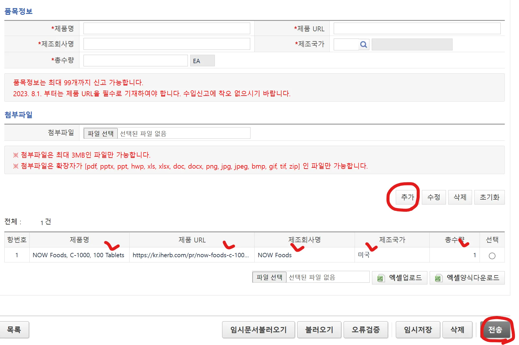 입력이 다 끝났으면 ‘추가’ 버튼을 누르고, 마지막에 ‘전송’ 버튼을 누르면 신고가 완료됩니다.