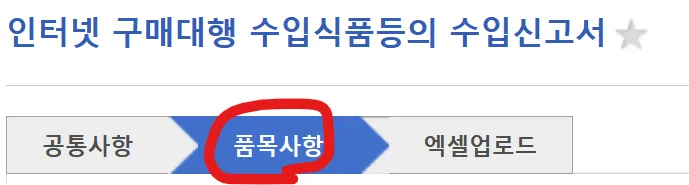 이제 본격적인 신청서 작성에 들어가게 됩니다. 신청서는 [공통사항]과 [품목사항], [엑셀업로드]로 이루어져 있는데, 다량을 한꺼번에 신고하는 경우가 아닌 한 [공통사항]과 [품목사항]만 입력을 하면 됩니다.