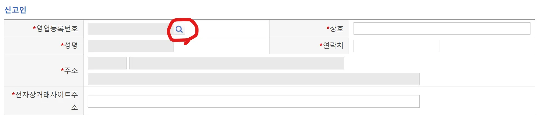 영업등록번호 옆의 돋보기 버튼을 클릭하여 본인 상호명으로 조회하시면