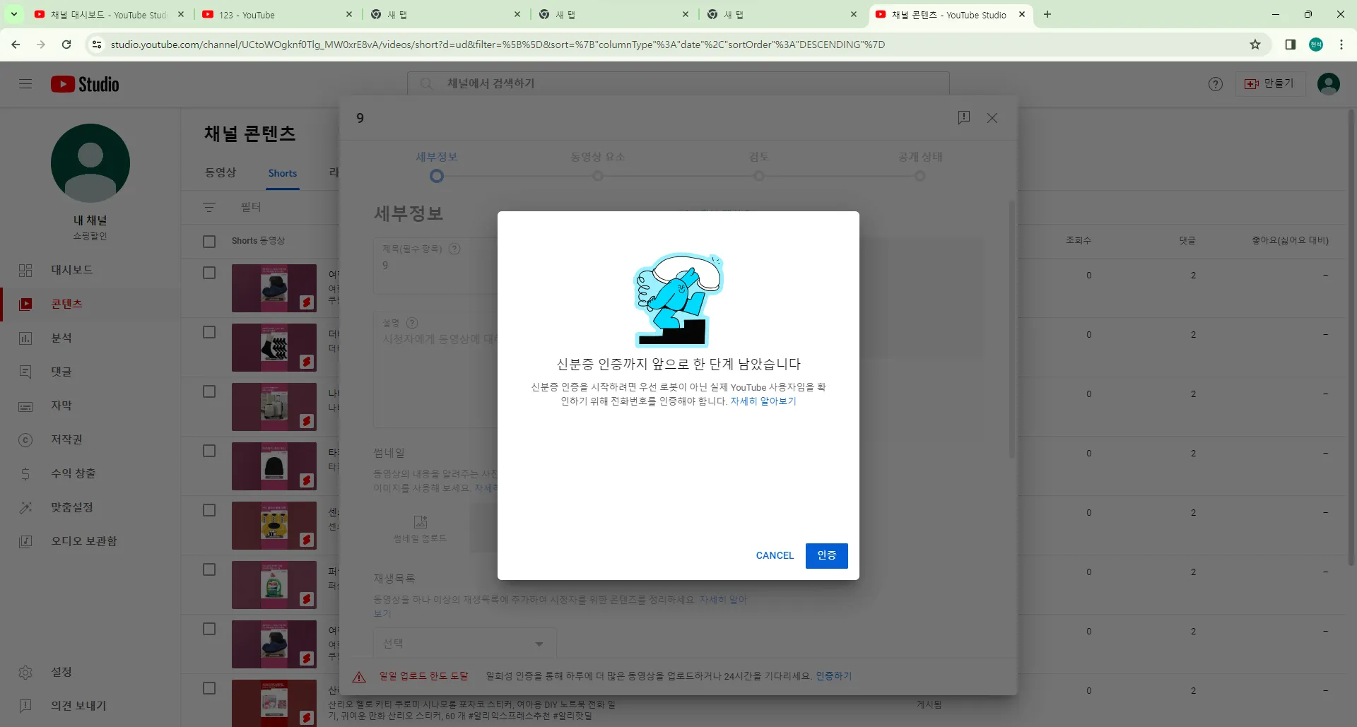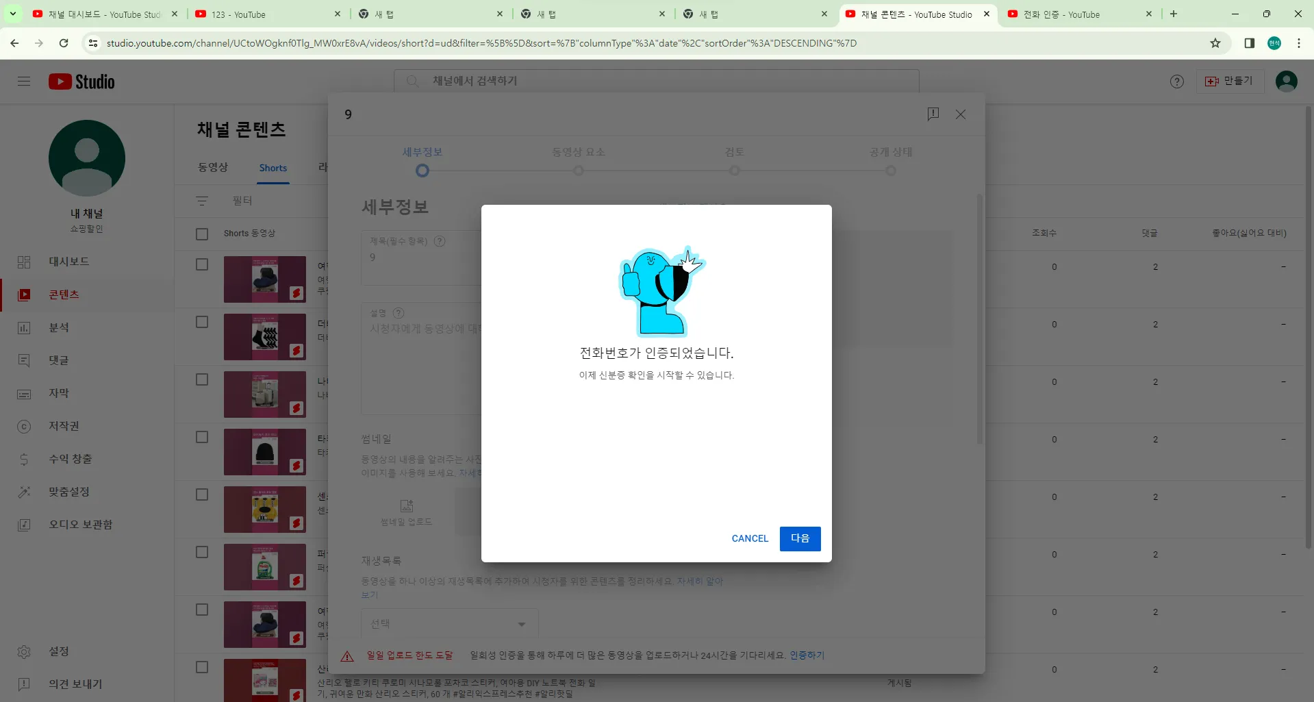 쇼츠 업로드를 위해 우상단 만들기 > 동영상 업로드 선택 or 좌측 콘텐츠 탭 > 동영상 업로드(파랑)버튼 선택