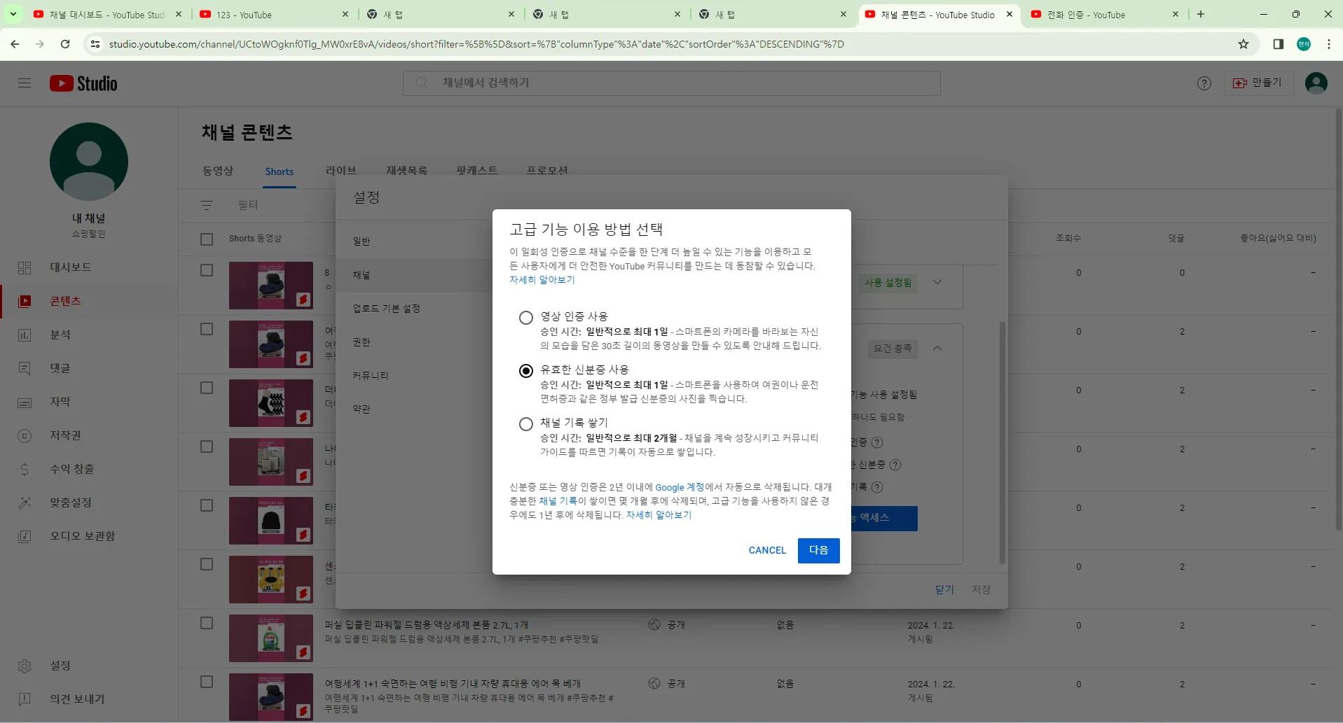 1~2일이 지나면 “매일 더 많은 Shorts 동영상 만들기” 고급기능이 사용 설정되어 있습니다.