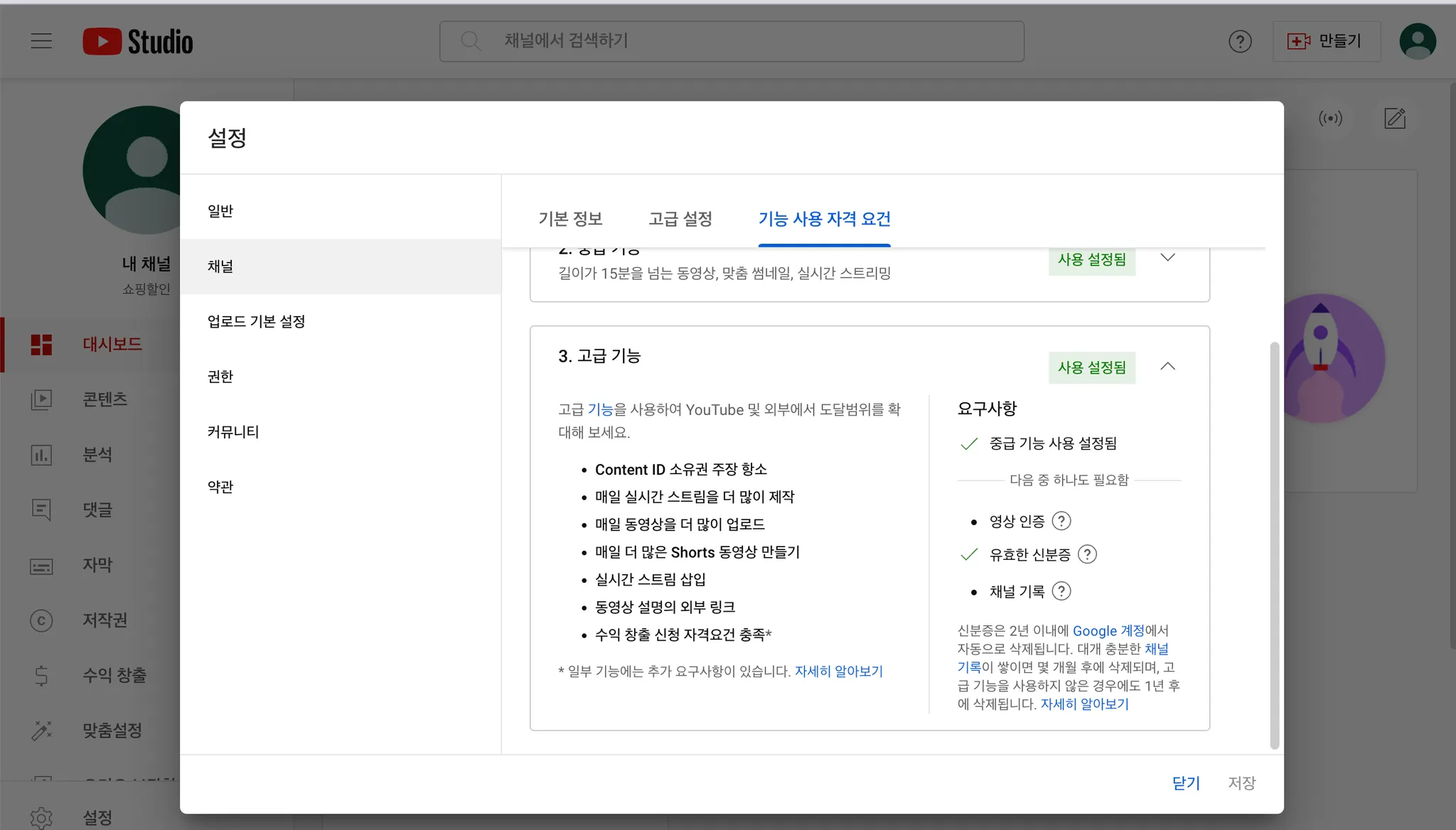 설정>채널>기능 사용 자격 요건 을 확인하시면 고급기능 검토 중인걸 확인 하실 수 있습니다.