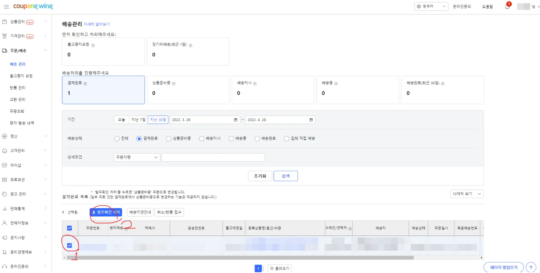 쿠팡의 경우에는 주문이 들어오면, 주문건을 선택하여 ‘발주확인처리’ 버튼을 눌러서 발주서를 다운로드 해야 고객의 통관고유부호를 확인하실 수 있습니다. 발주서 엑셀파일은, 주문건을 선택한 상태에서 화면 우측 엑셀버튼을 누르면 다운받으실 수 있습니다.
