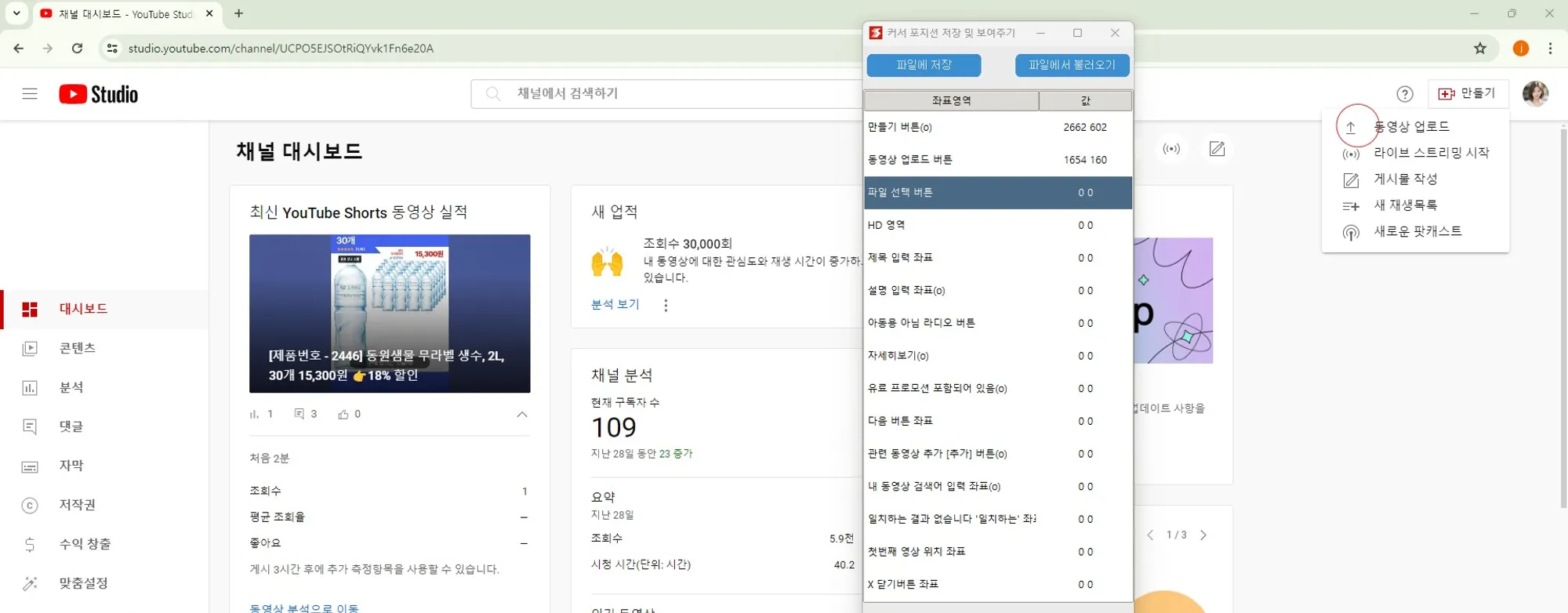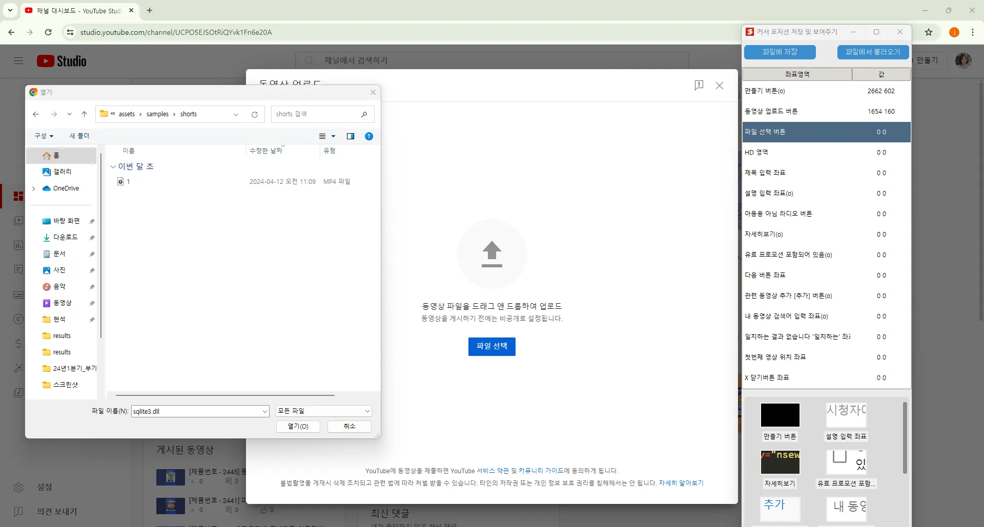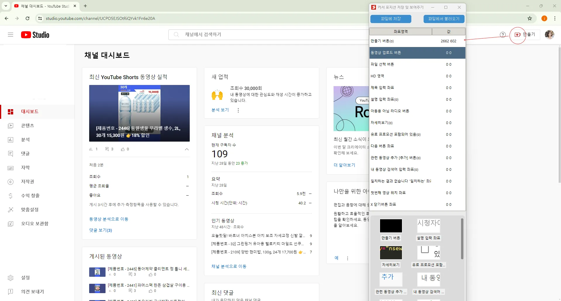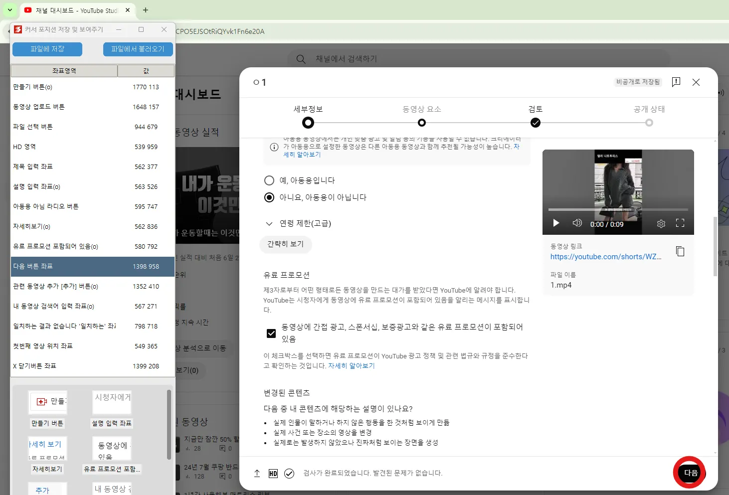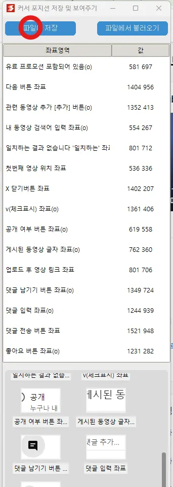 유튜브에 쇼츠 자동 업로드를 위해서 업로드시 사용하는 버튼의 좌표를 저장합니다.