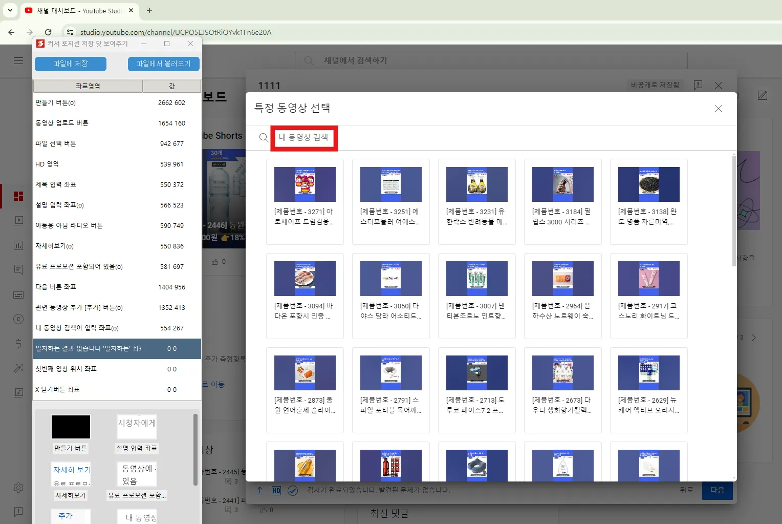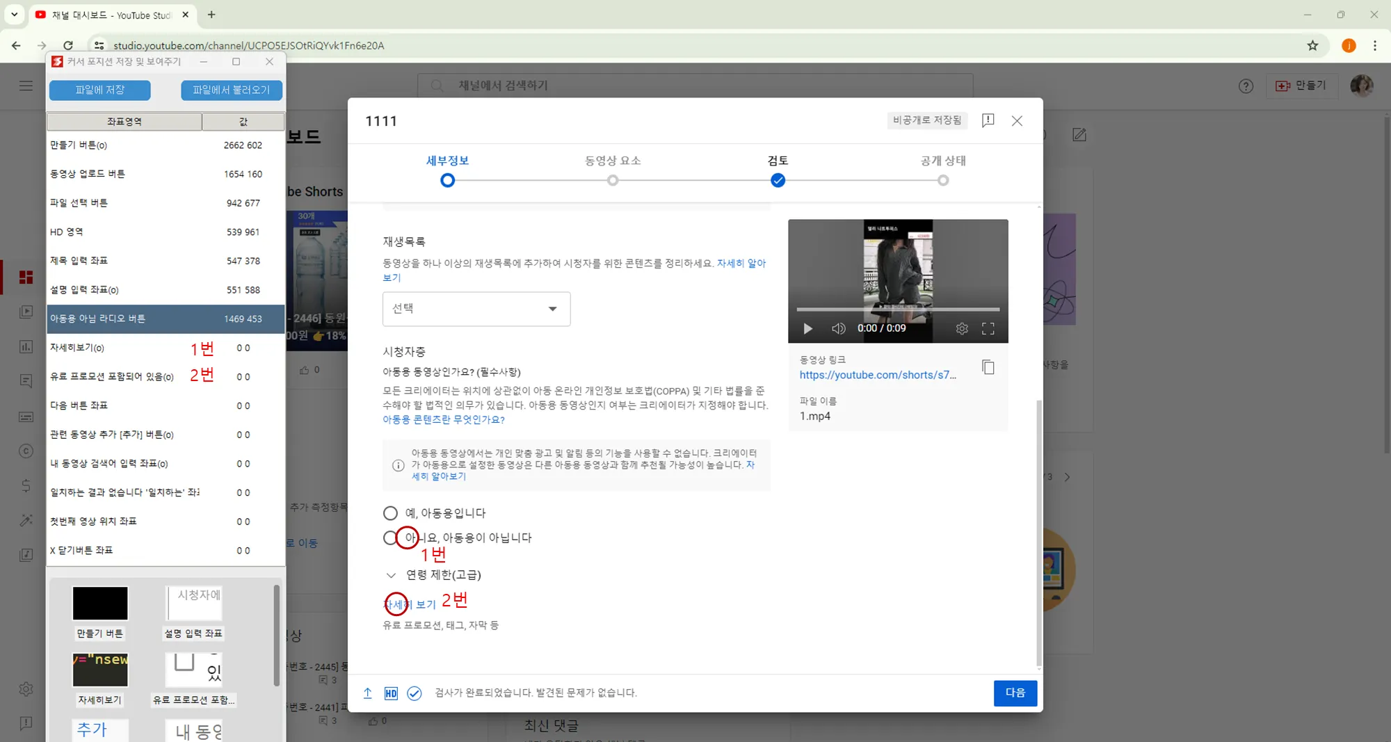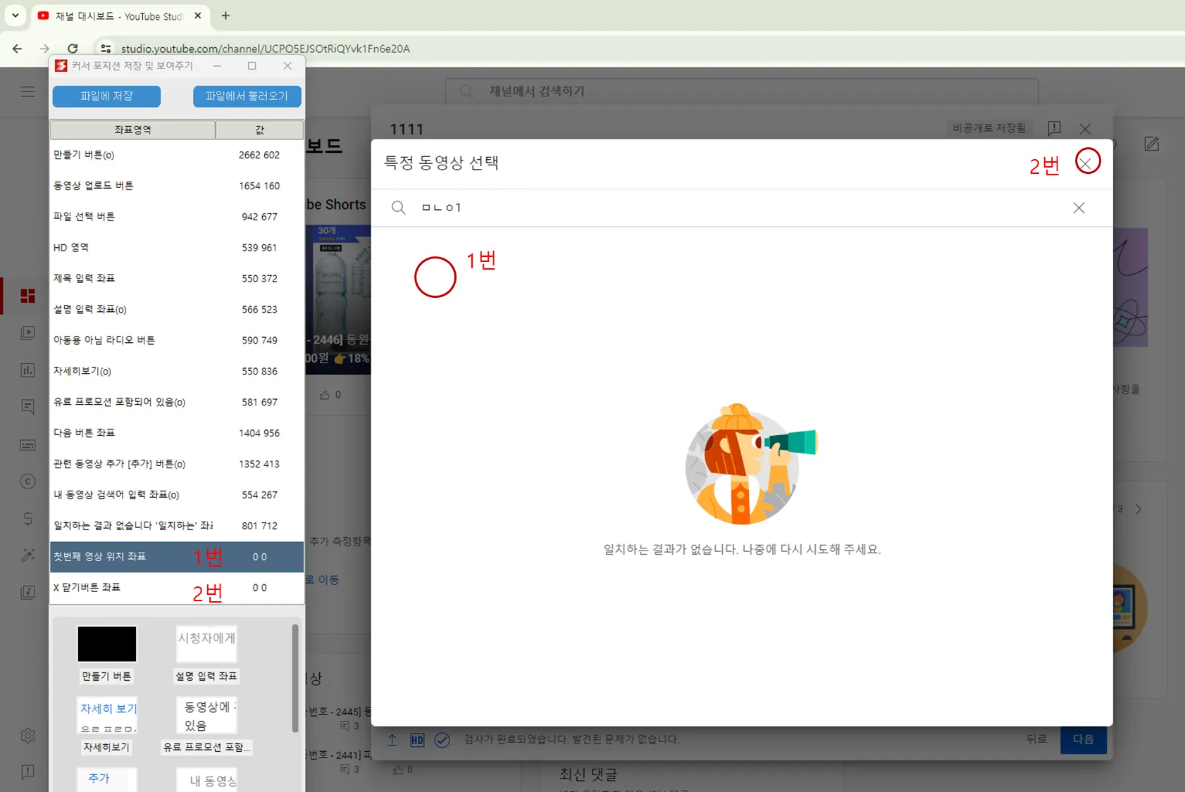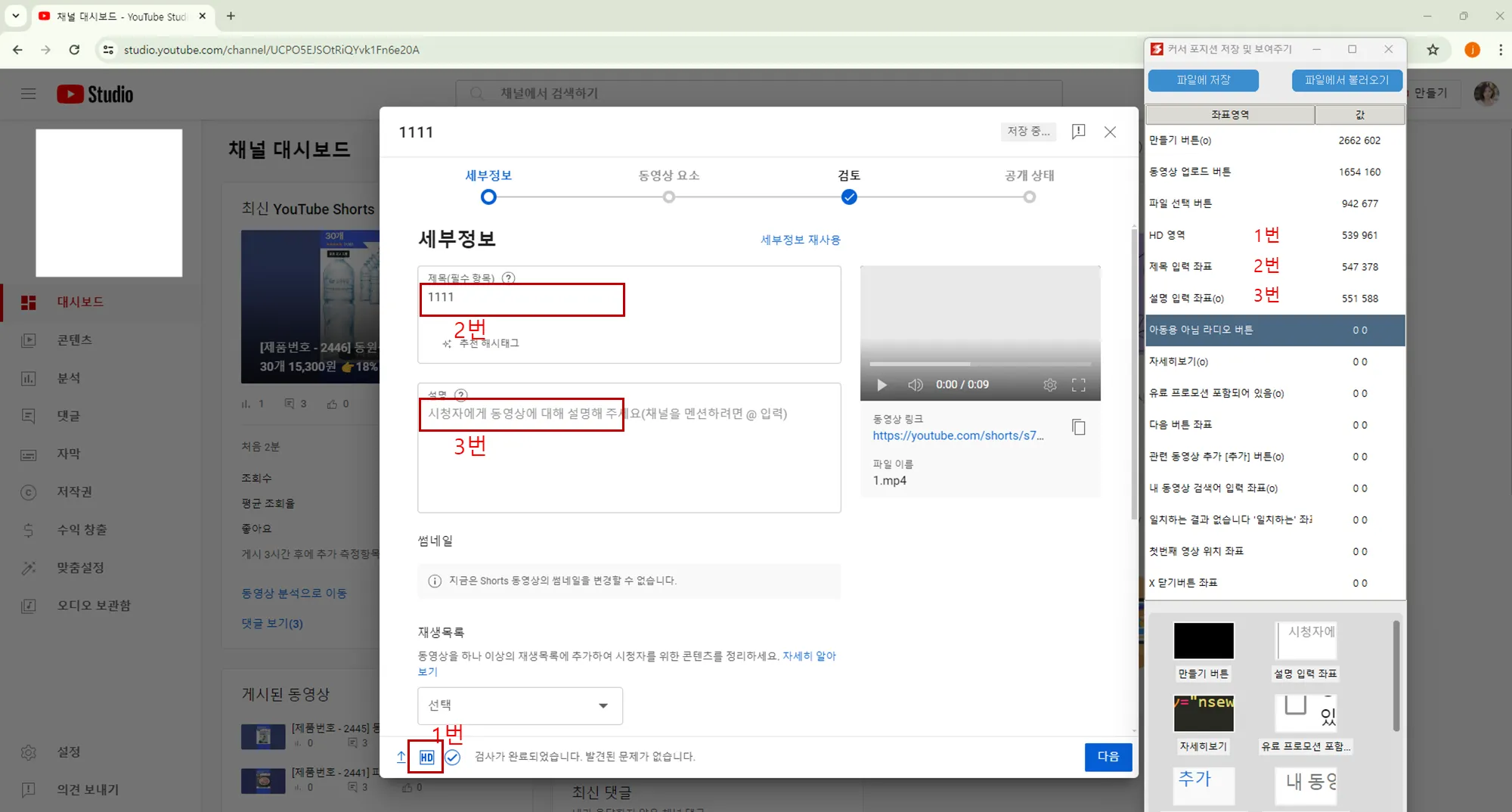 유튜브에 쇼츠 자동 업로드를 위해서 업로드시 사용하는 버튼의 좌표를 저장합니다.