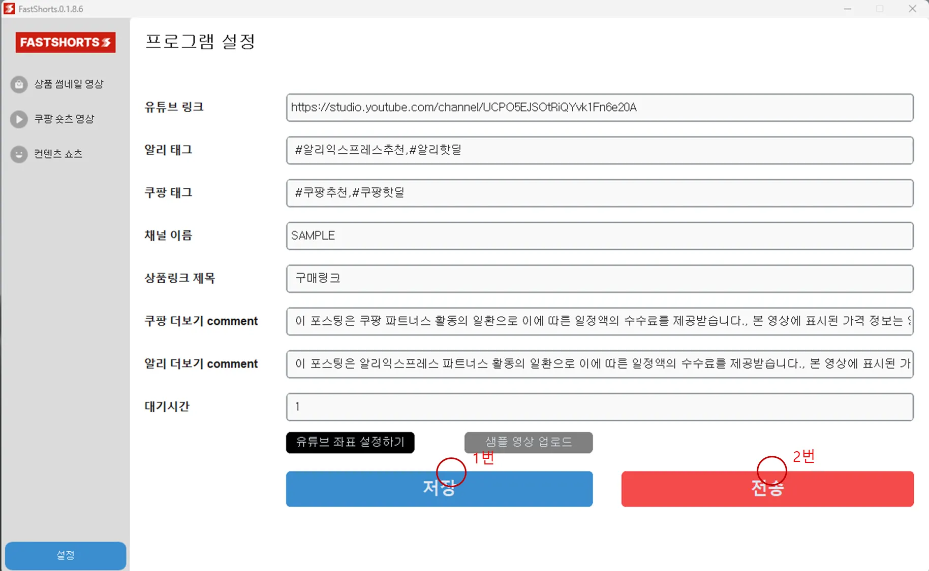 완료 후, 패스트쇼츠 설정 창에서 저장, 전송을 완료해주시면 됩니다