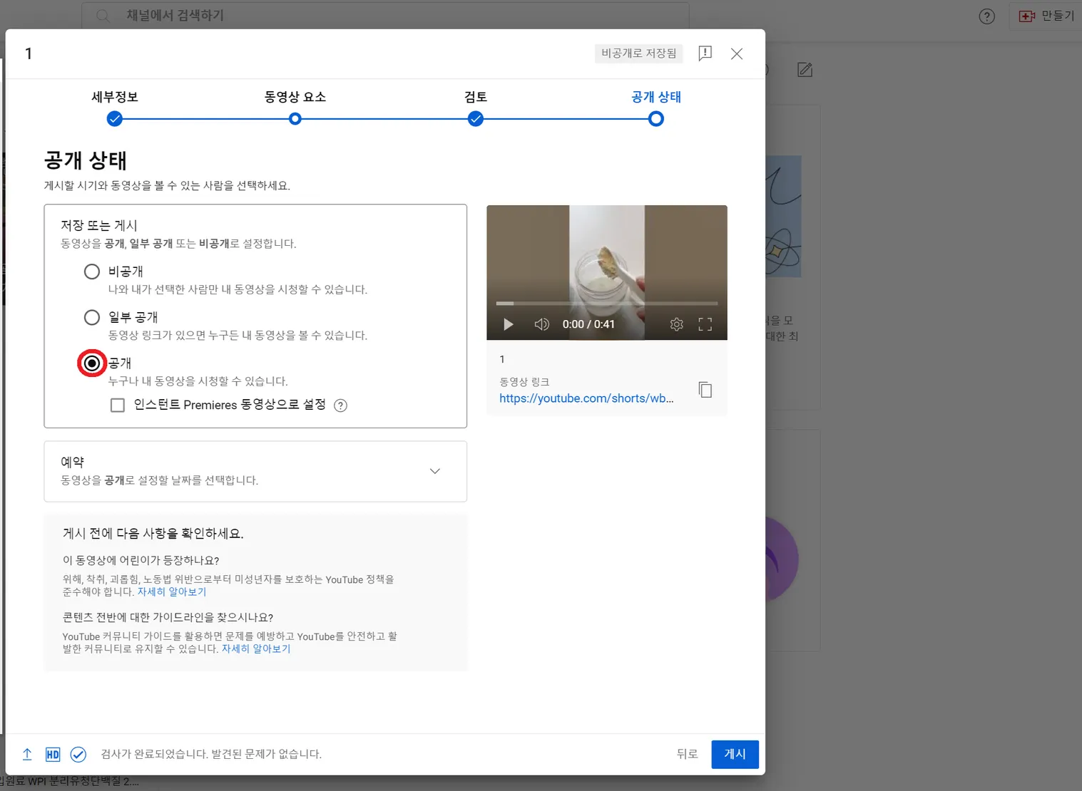 “공개” 옆의 선택 버튼에 마우스 커서를 두고 키보드의 숫자 1을 누르고 하단의 게시 버튼을 선택 합니다.