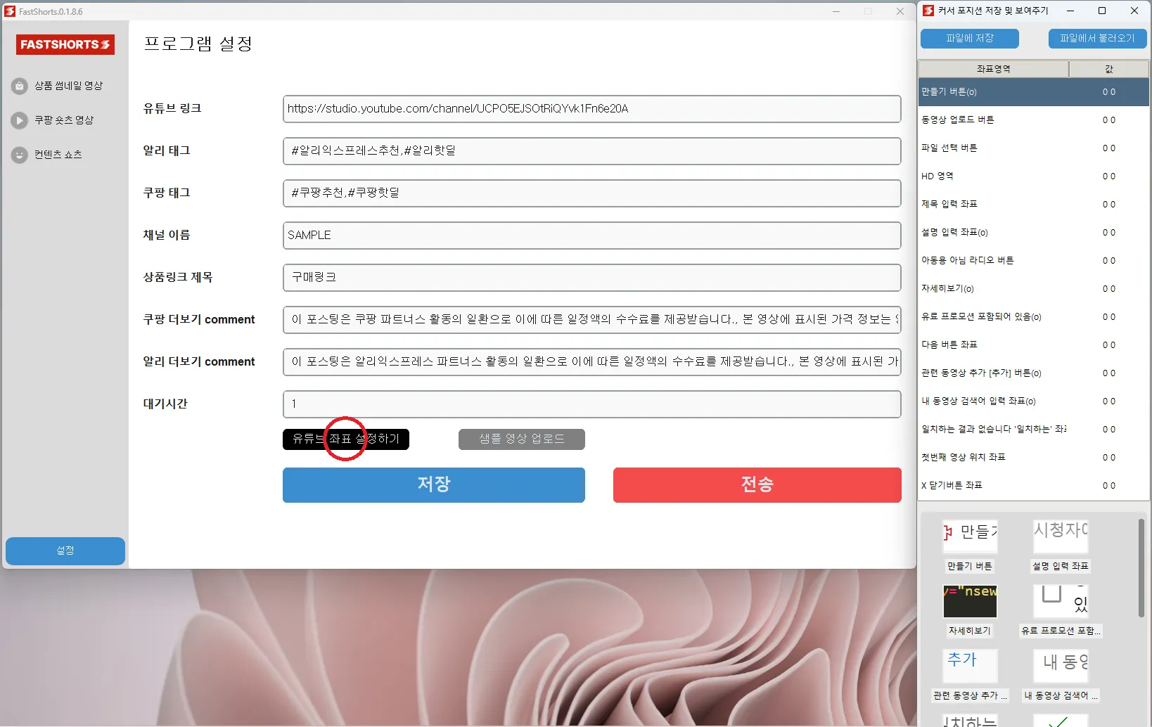 설정에서 “유튜브 좌표 설정하기”를 클릭합니다.