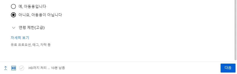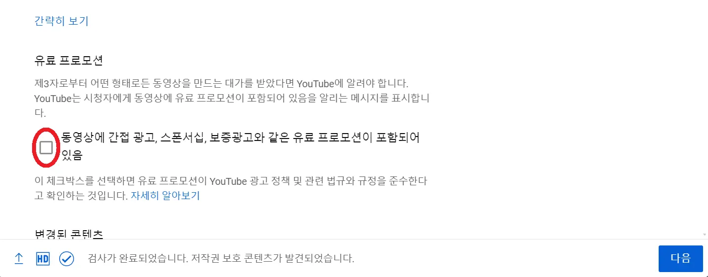 “자세히 보기”를 눌러 아래 화면이 나오면 “동영상에 간접 광고, 스폰서십~” 좌측에 있는 체크박스위에 마우스 커서를 두고 키보드의 숫자 1을 누릅니다. 이후 해당 체크박스를 클릭합니다.